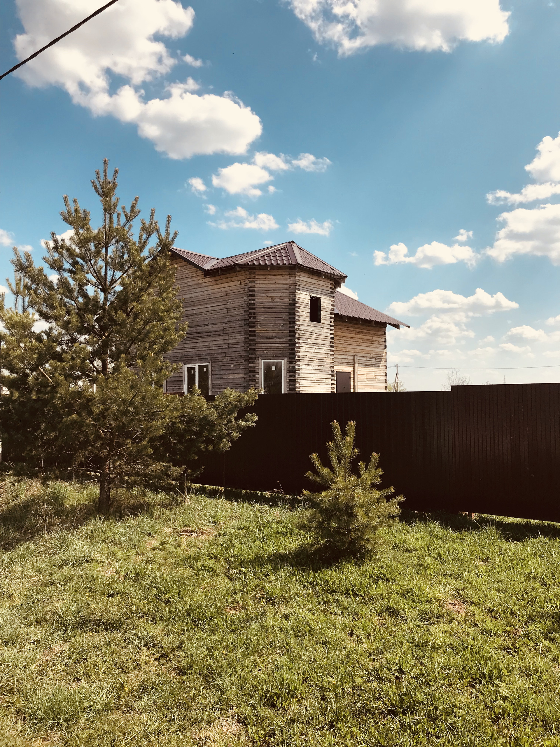 Забор- по границе участка, 1 сторона- профнастил, остальные- сетка рабица.