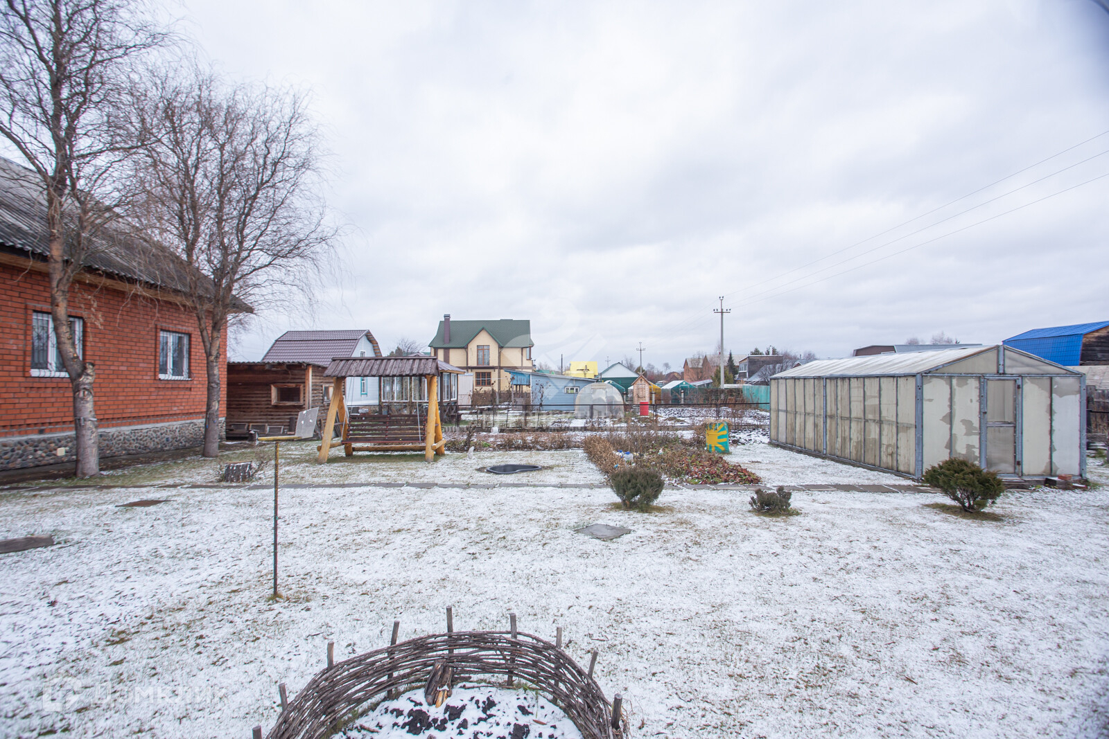 Большой газон, беседка. Две большие теплицы.