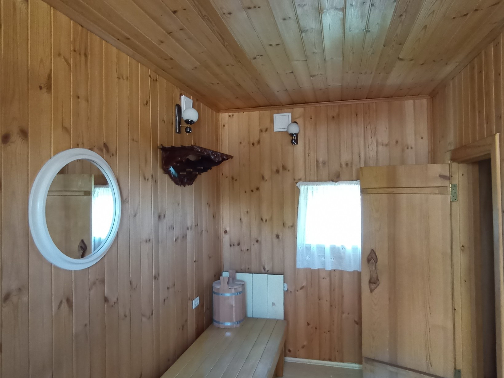 Внутреннее помещение бани: евровагонка из кедра, пробкового дерева, что создаёт неповторимый приятный аромат,