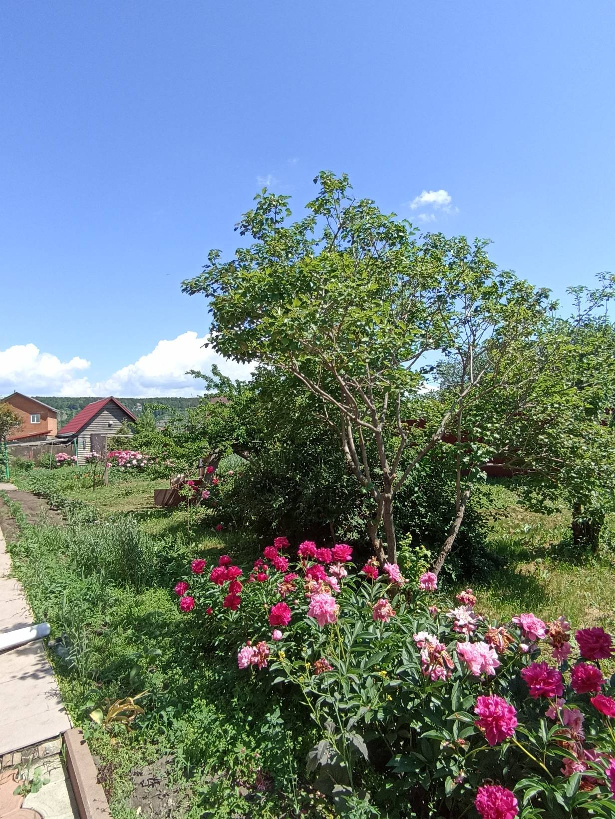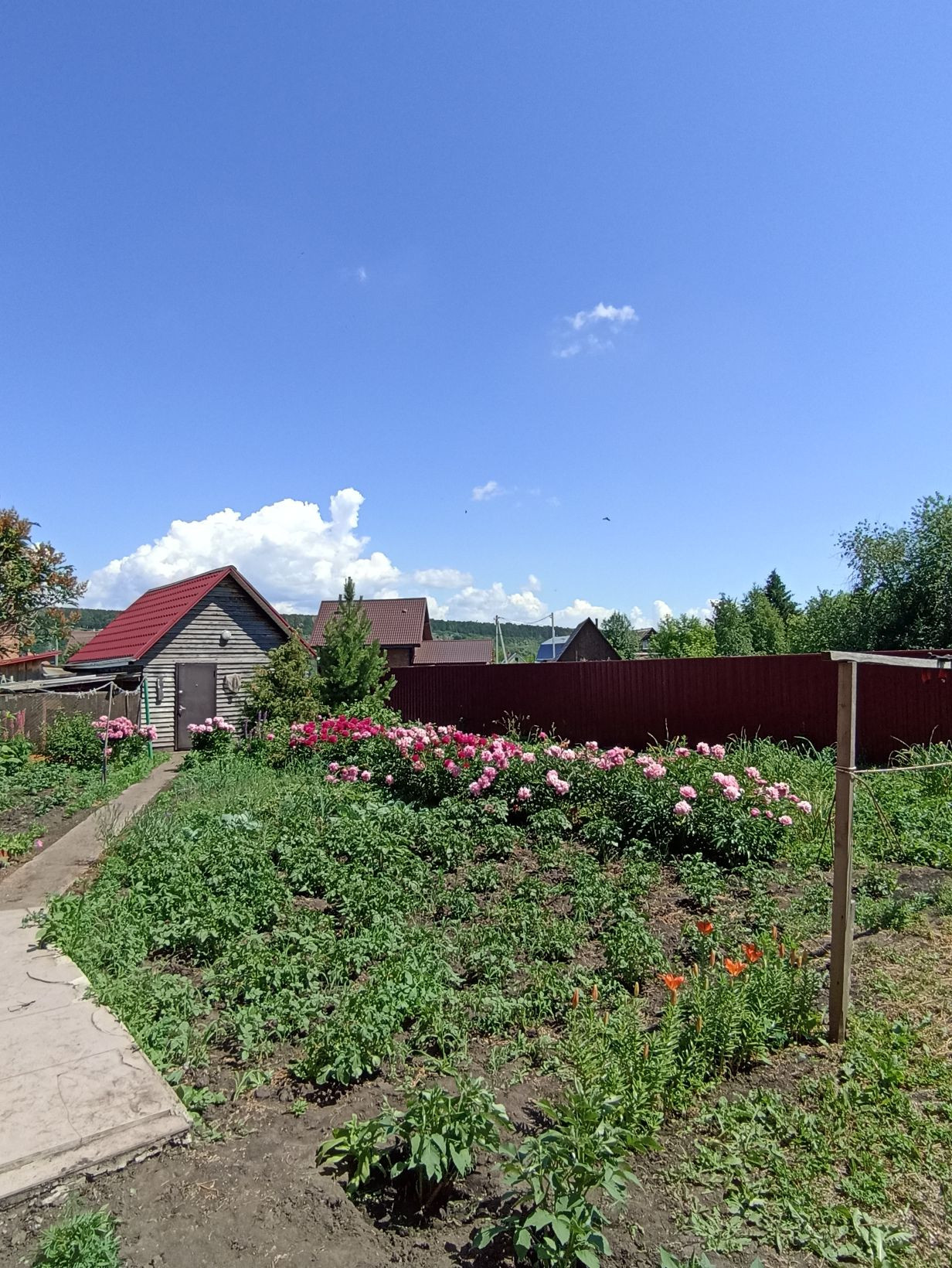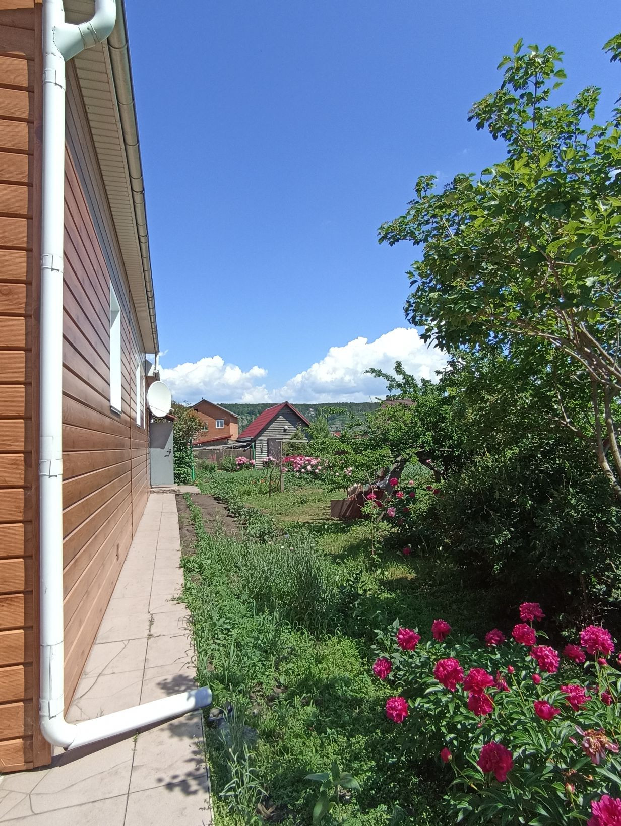 Добротный, кирпичный Коттедж, утопающий в зелени, пионах, с видом на противоположный высокий берег Томи.