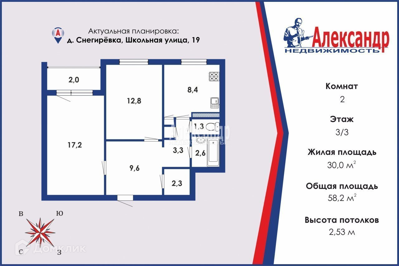 2-комнатная квартира, 58.2 м2, этаж 3 / 3, на продажу в деревне Снегирёвке, Школьная улица, 19