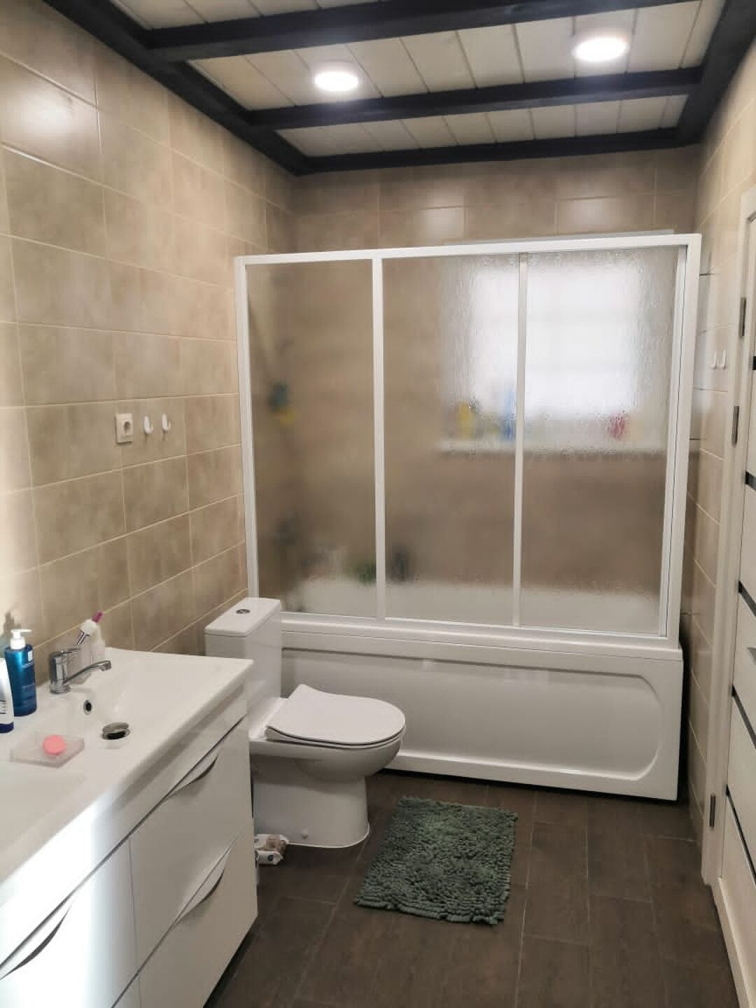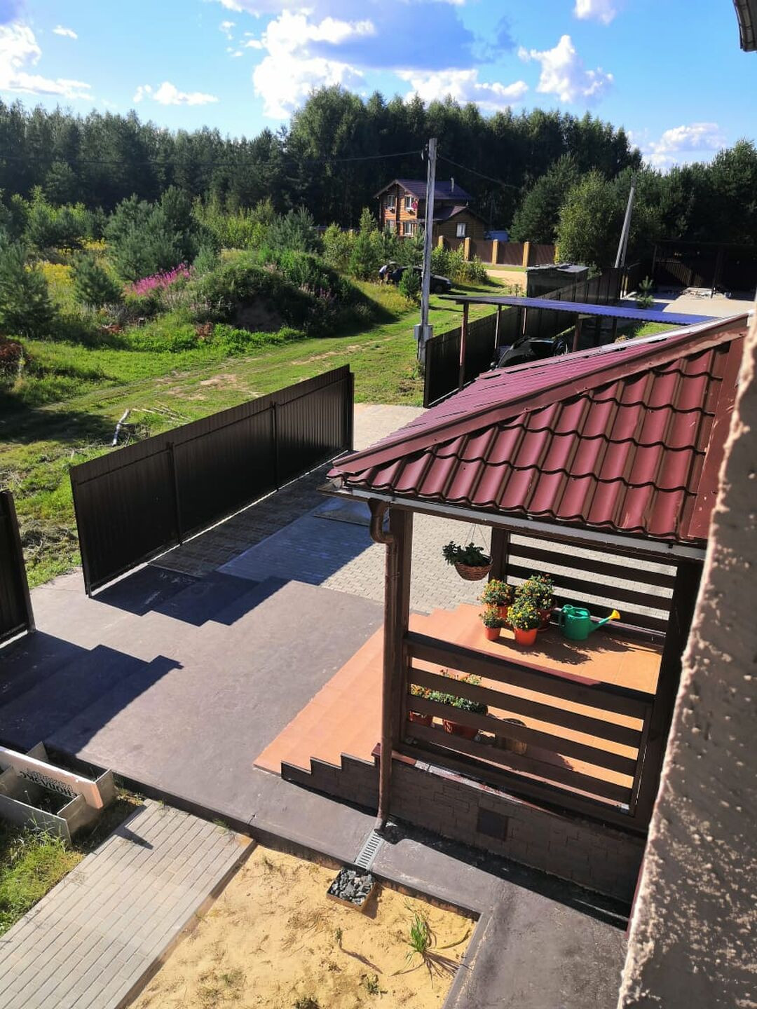 Есть веранда, два парковочных места под навесом и гараж на две машины.