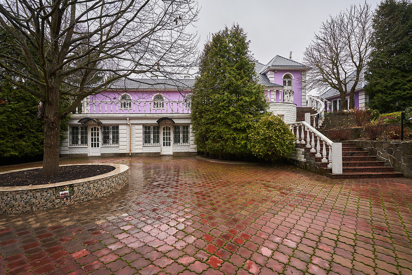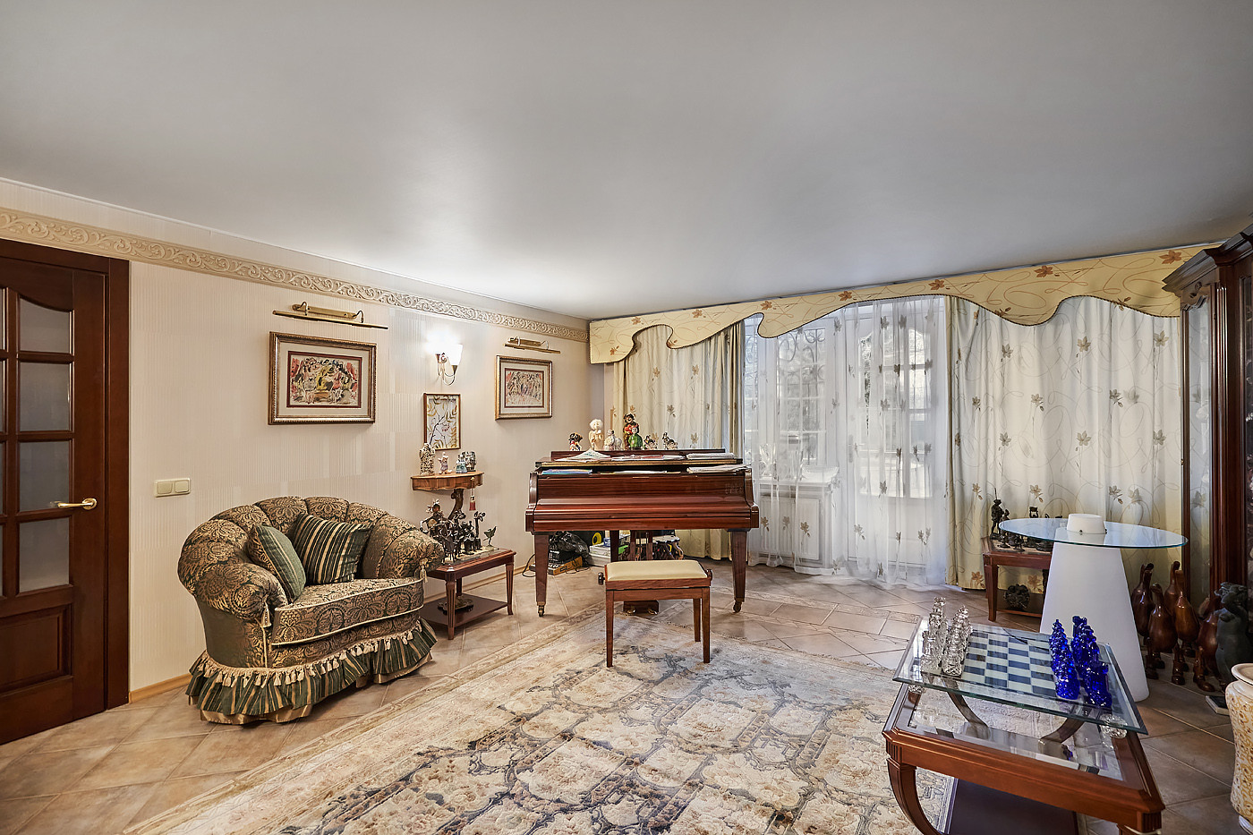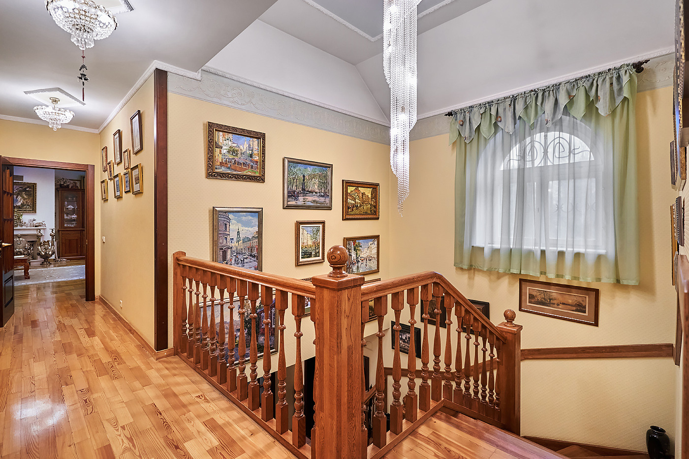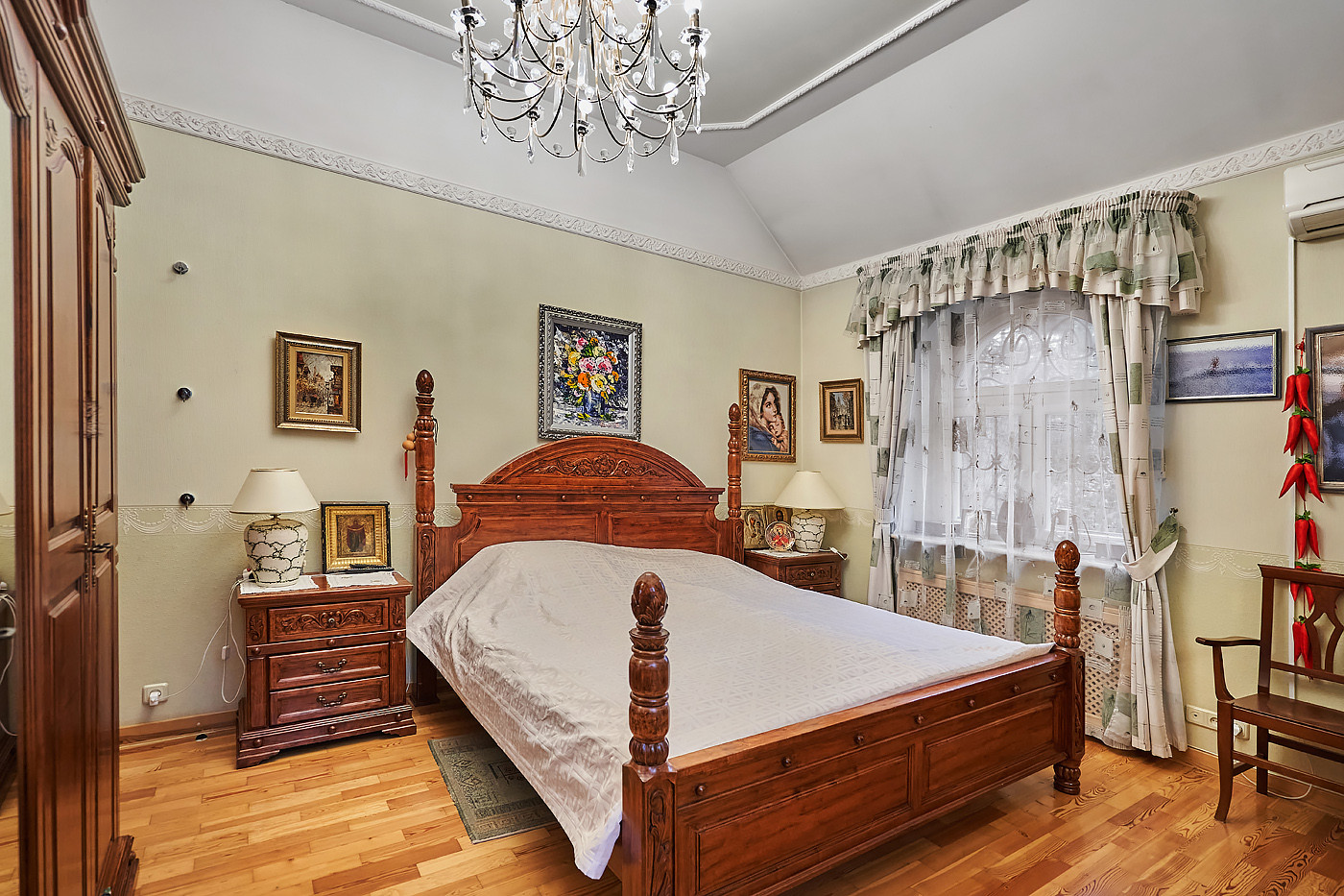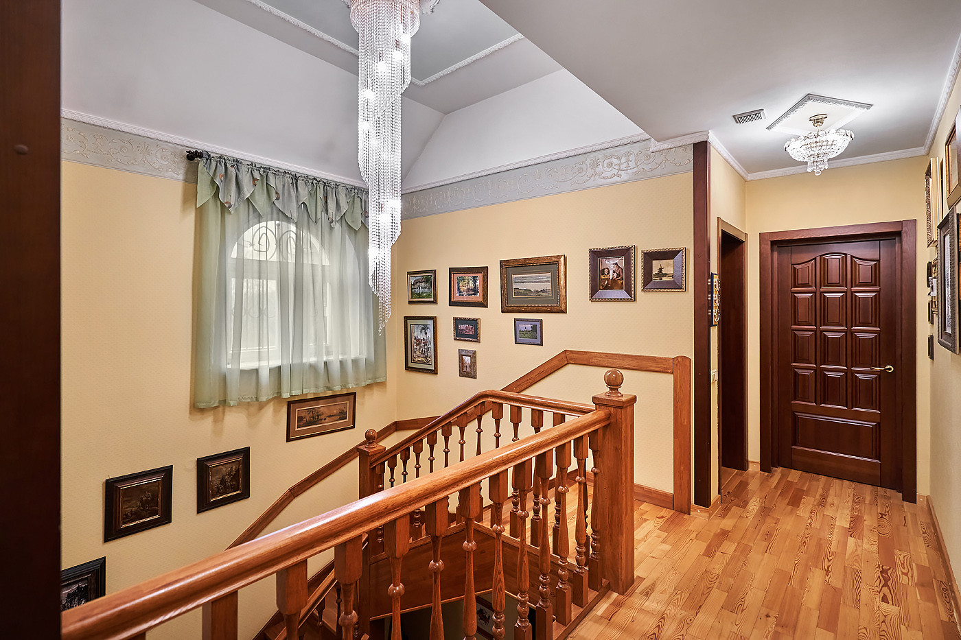 Внутренние интерьеры выполнены в классическом стиле. Двери фирмы "Мекран", лестницы премиум класса из натурального дерева, дубовый паркет, итальянская плитка керамогранит, финские деревянные арочные окна, бронированные двери фирмы "Belca" и тд. Установлены кондиционеры, система очистки и умягчения воды, вентиляционная система для обслуживания бассейна, котельная с газовыми котлами De Dietrich, автоматические гаражные ворота, установлена система автоматического полива газонов и клумб.