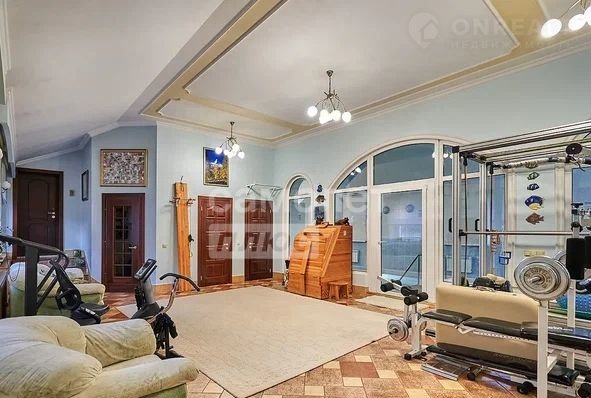 В доме имеется спорт зал и бассейн (длина бассейна 18 м., глубина 2,1 и 1,6 м.), две спальни, кабинет, два душа и туалета, кладовая, гостинная-кухня из которой можно выйти на террасу.