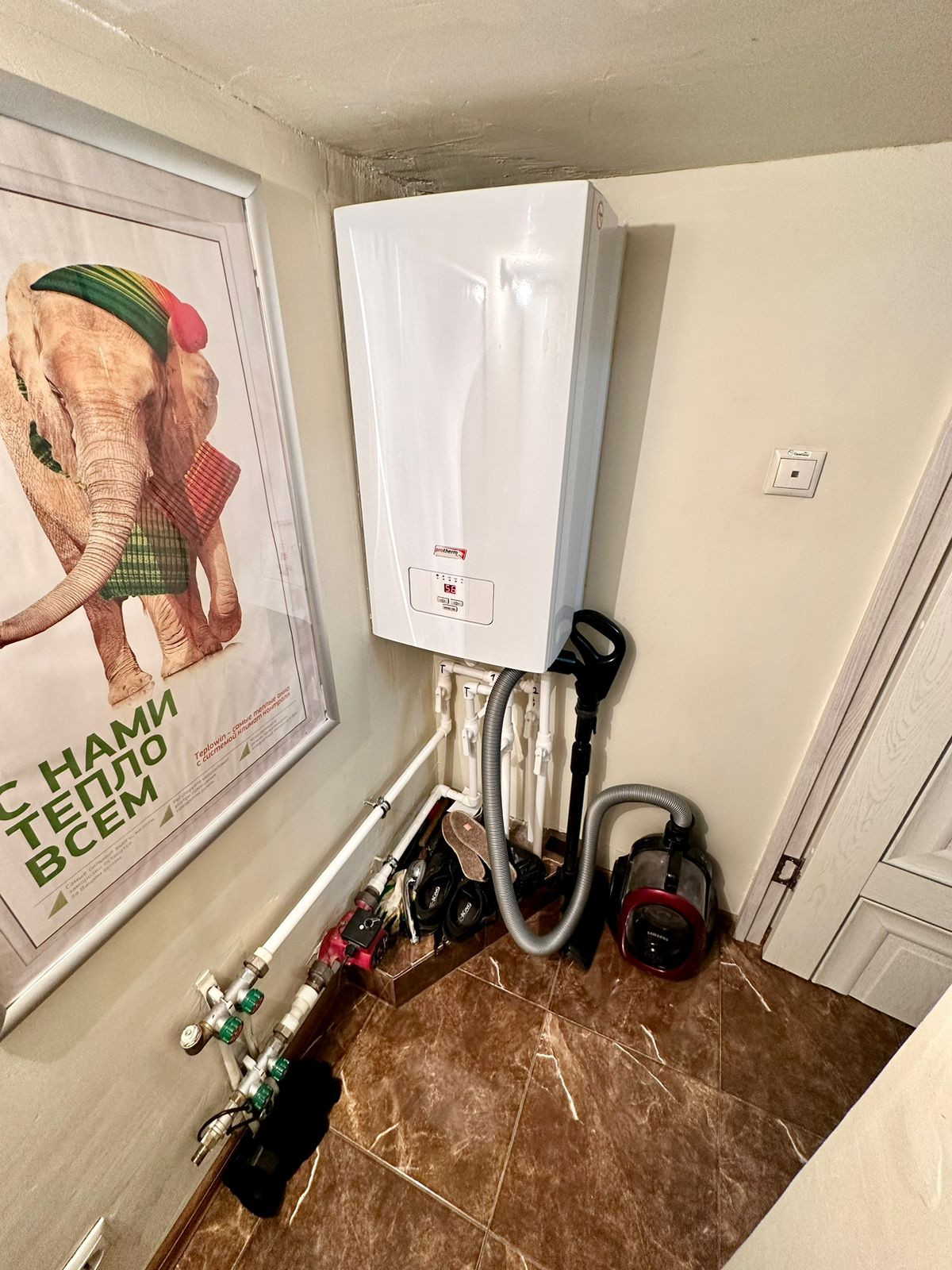 В доме установлена система "теплый пол", электро котел, газ в процессе подключения.
