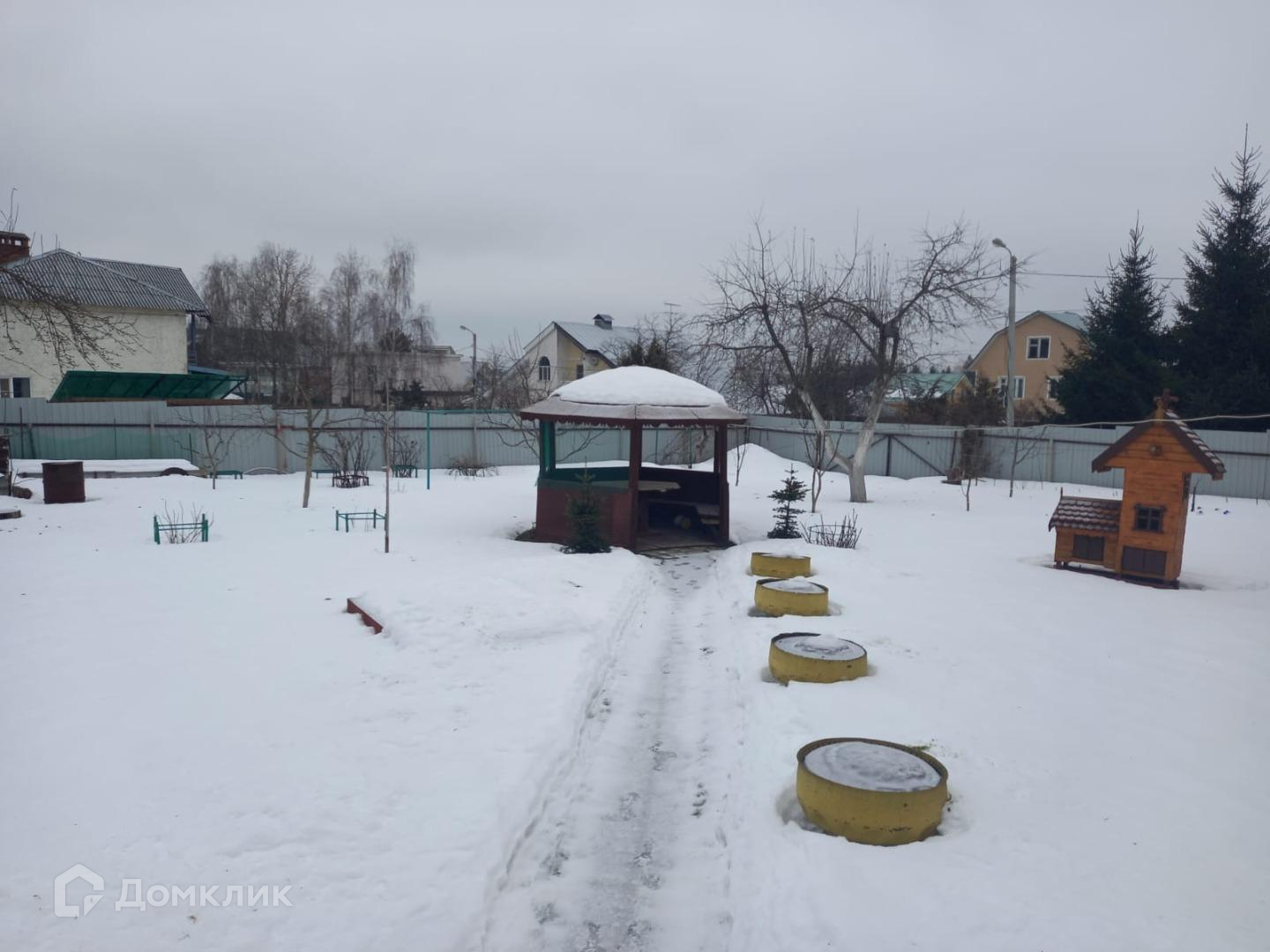 Участок 7 соток, огорожен сплошным забором. Парковка на территории. Плодовый сад. Зона отдыха с беседкой, баня.