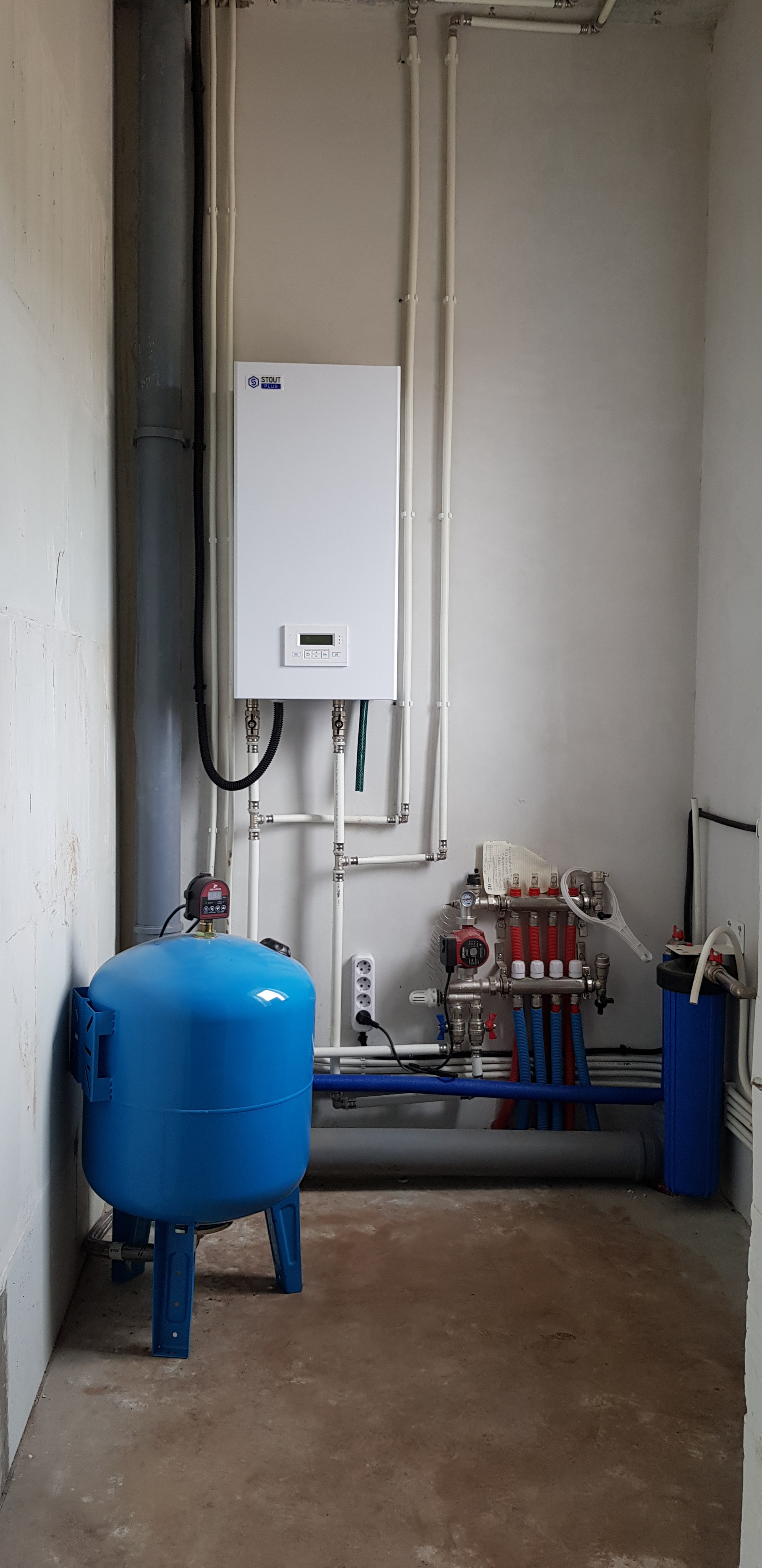 Отопление: 1й этаж- теплые полы, 2й этаж- радиаторы, автоматический электрокотел фирмы Stout 14КВТ.