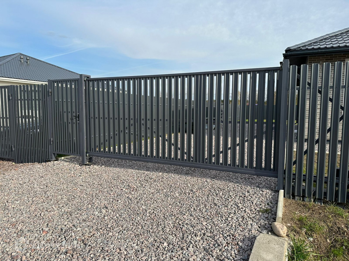 Забор с откатными воротами. Стоянка на 3 машины.