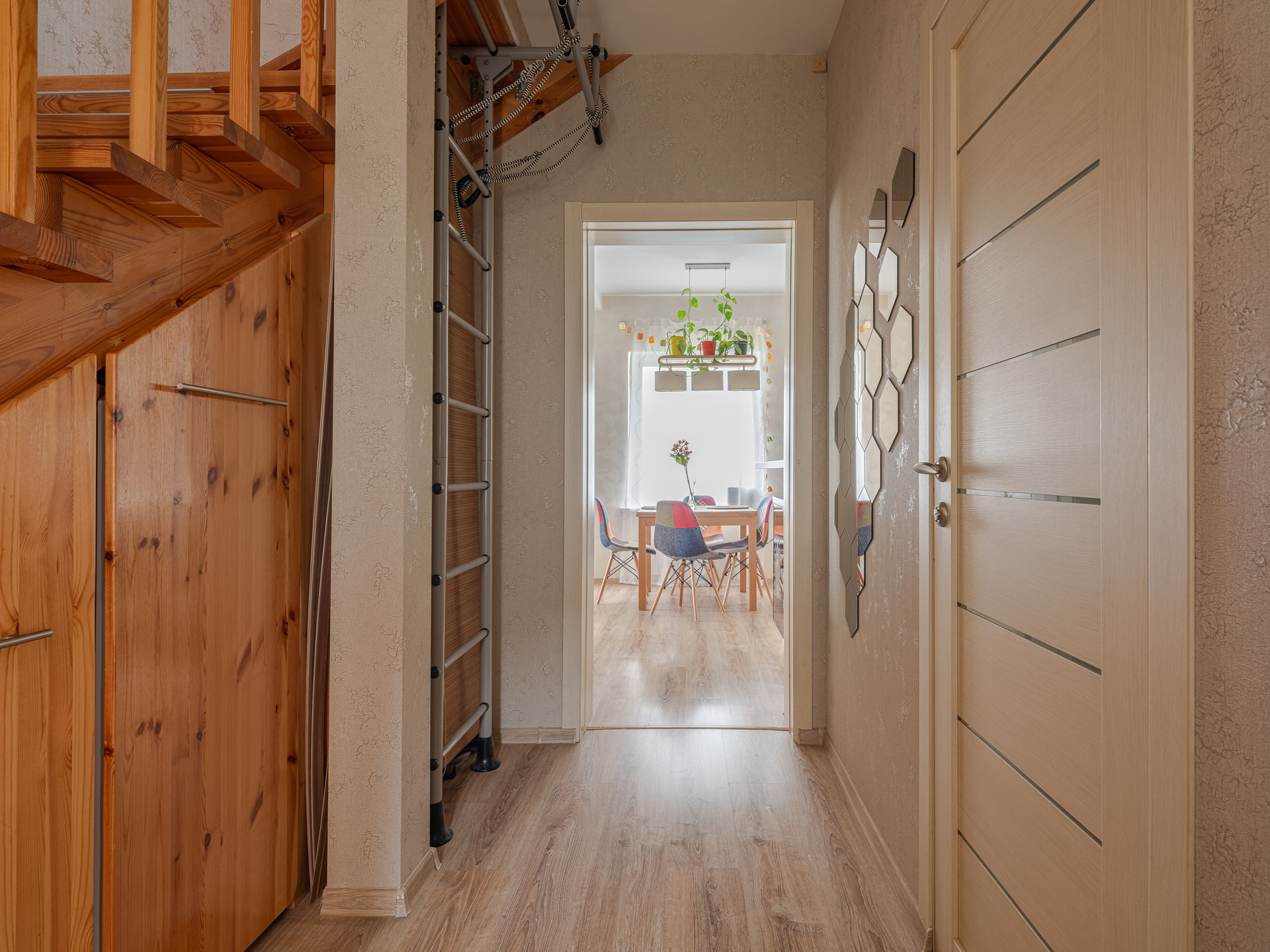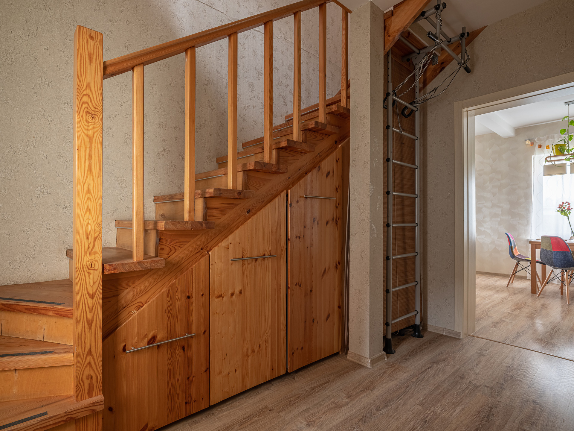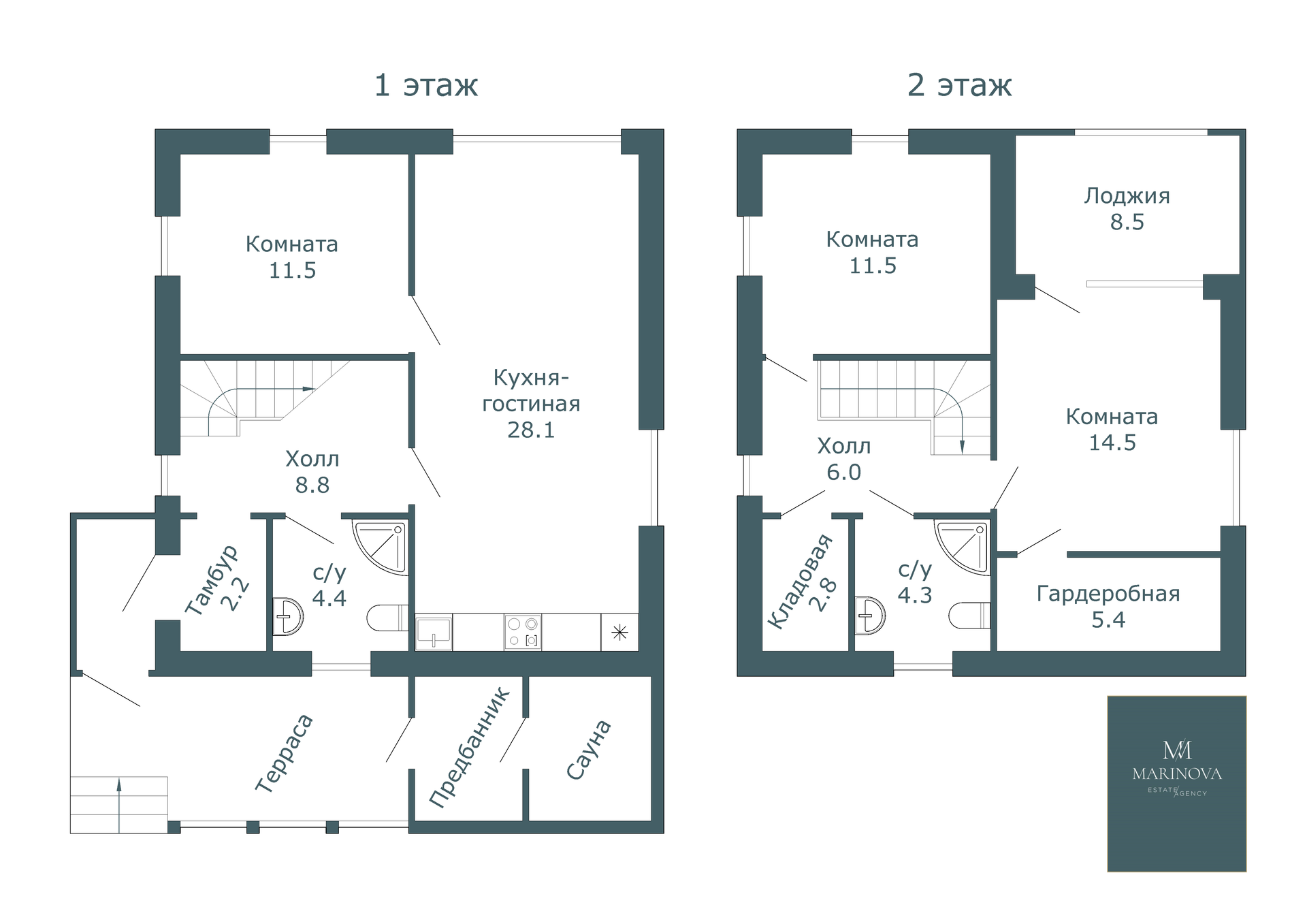 На 1 этаже: кухня-гостиная, спальня, сан.узел. Кухня-гостиная 28,1 кв.м. с кухонным гарнитуром и диваном. Под лестницей место для хранения вещей.