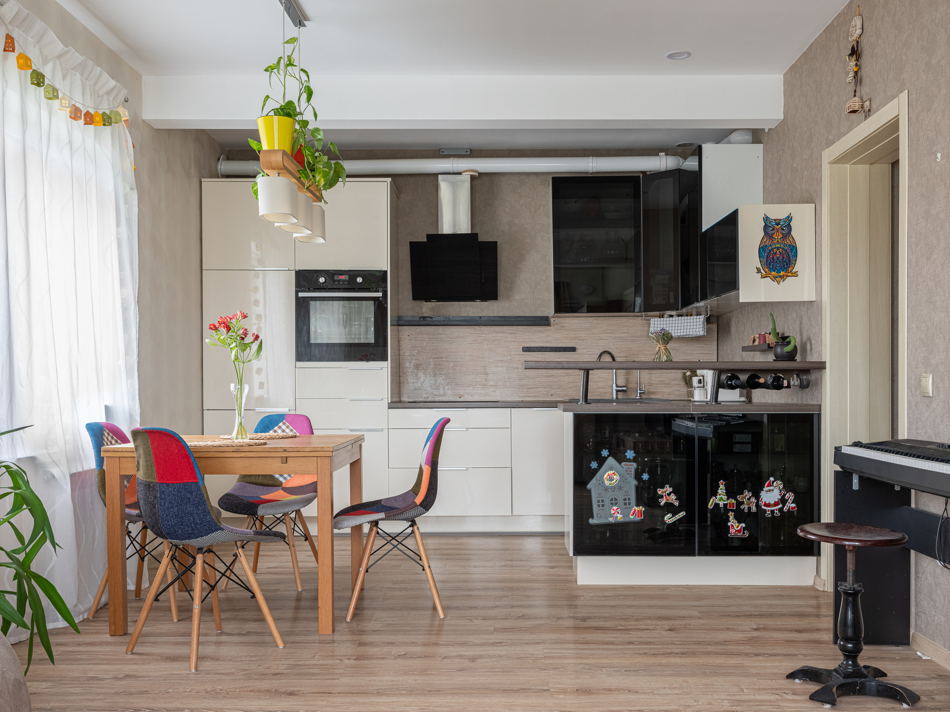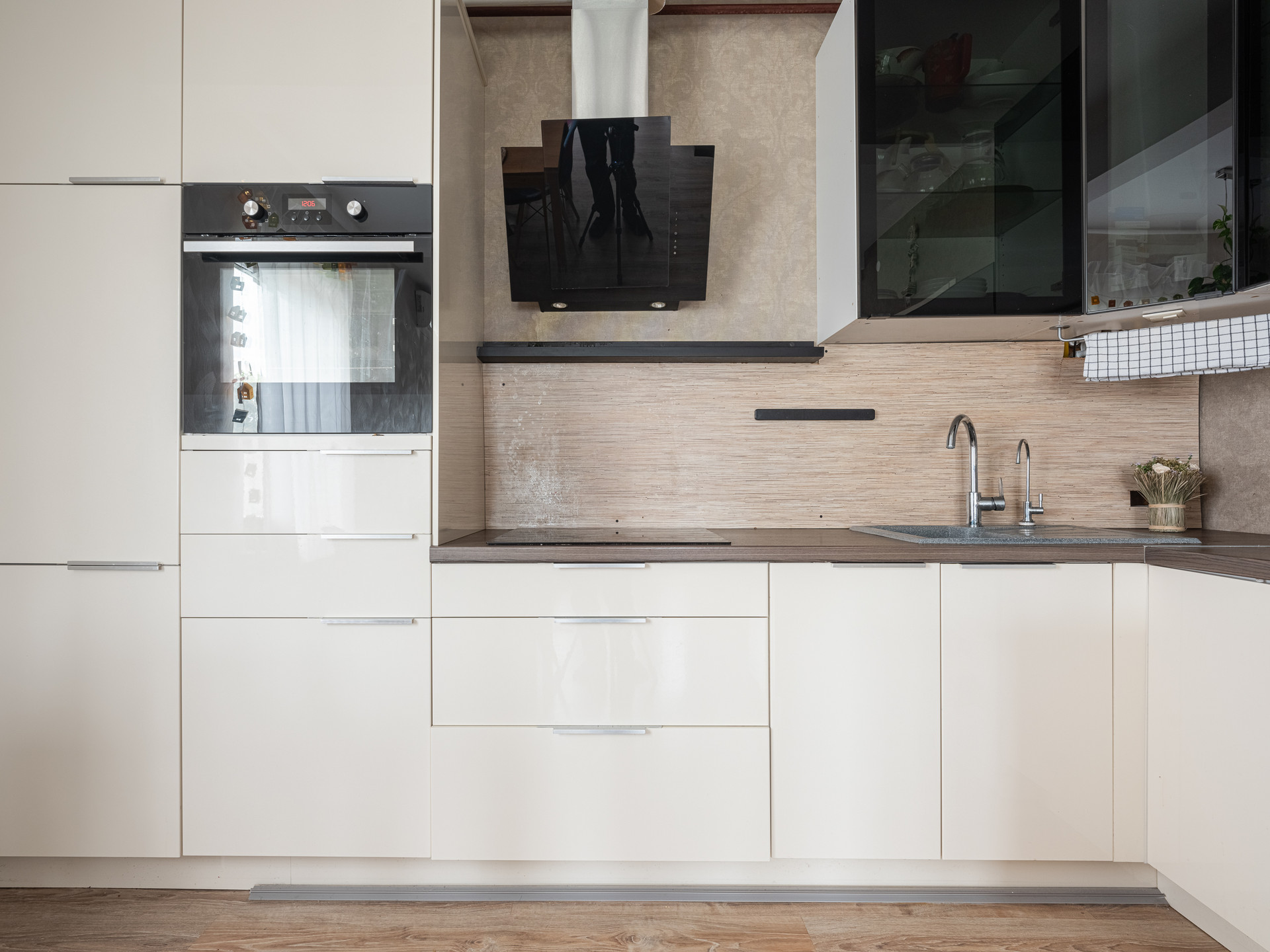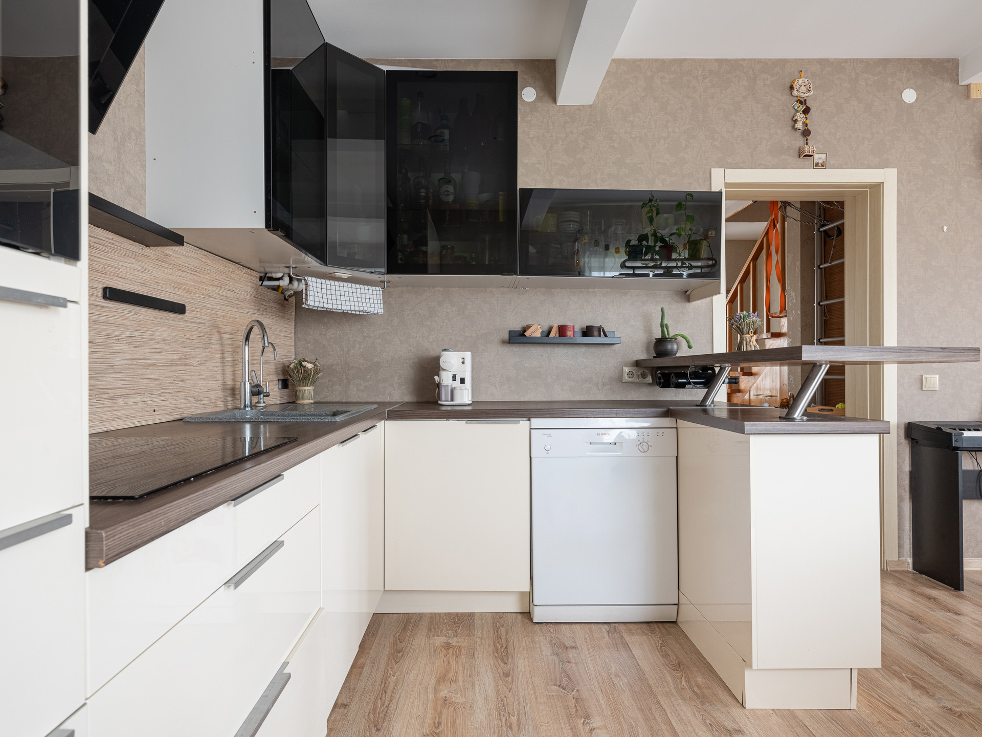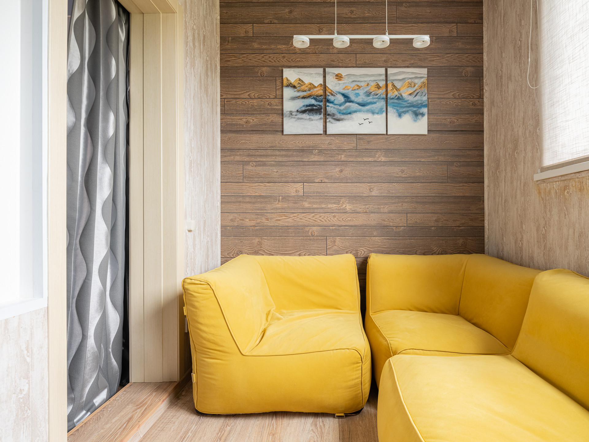На 1 этаже: кухня-гостиная, спальня, сан.узел. Кухня-гостиная 28,1 кв.м. с кухонным гарнитуром и диваном. Под лестницей место для хранения вещей.