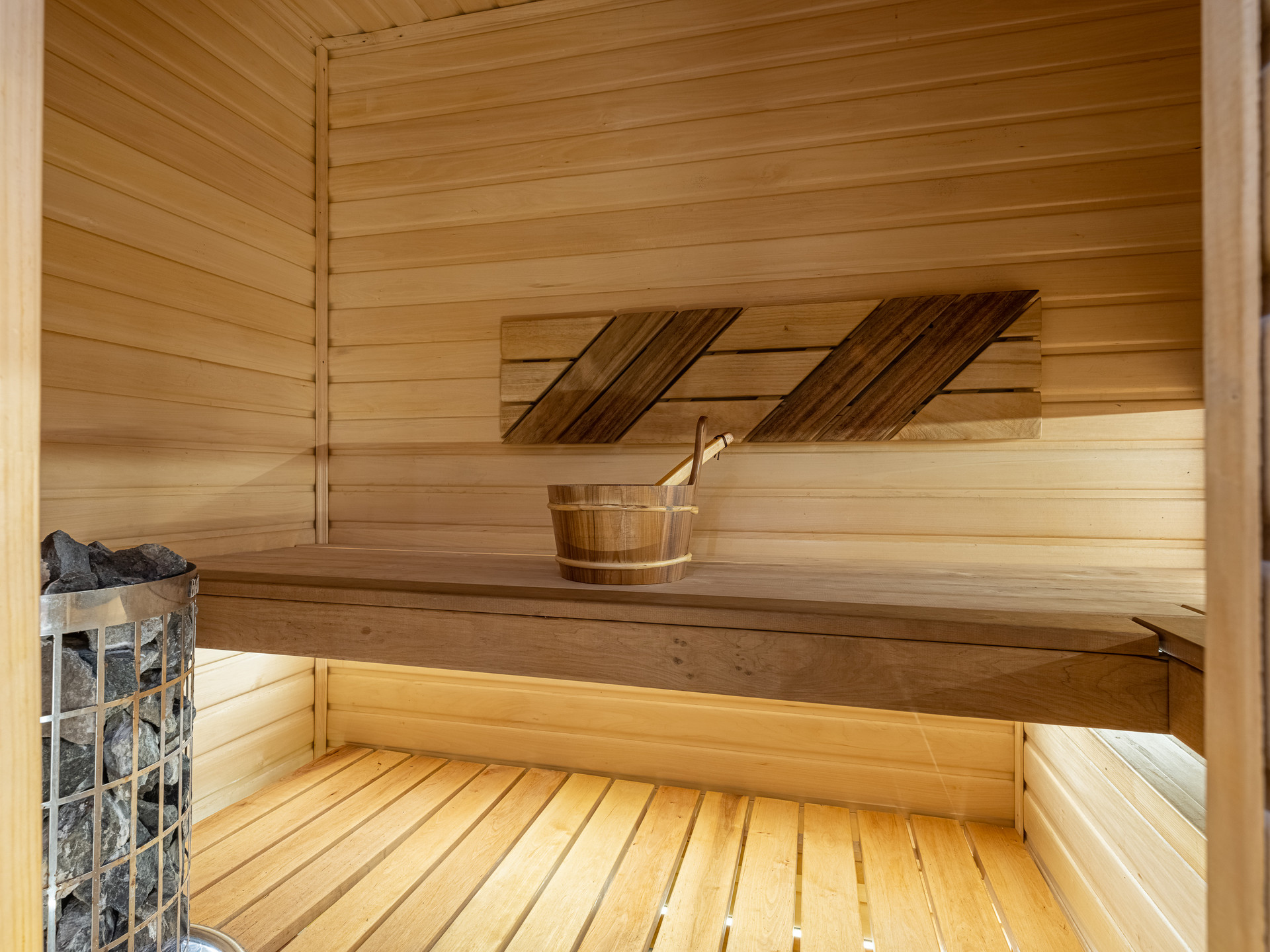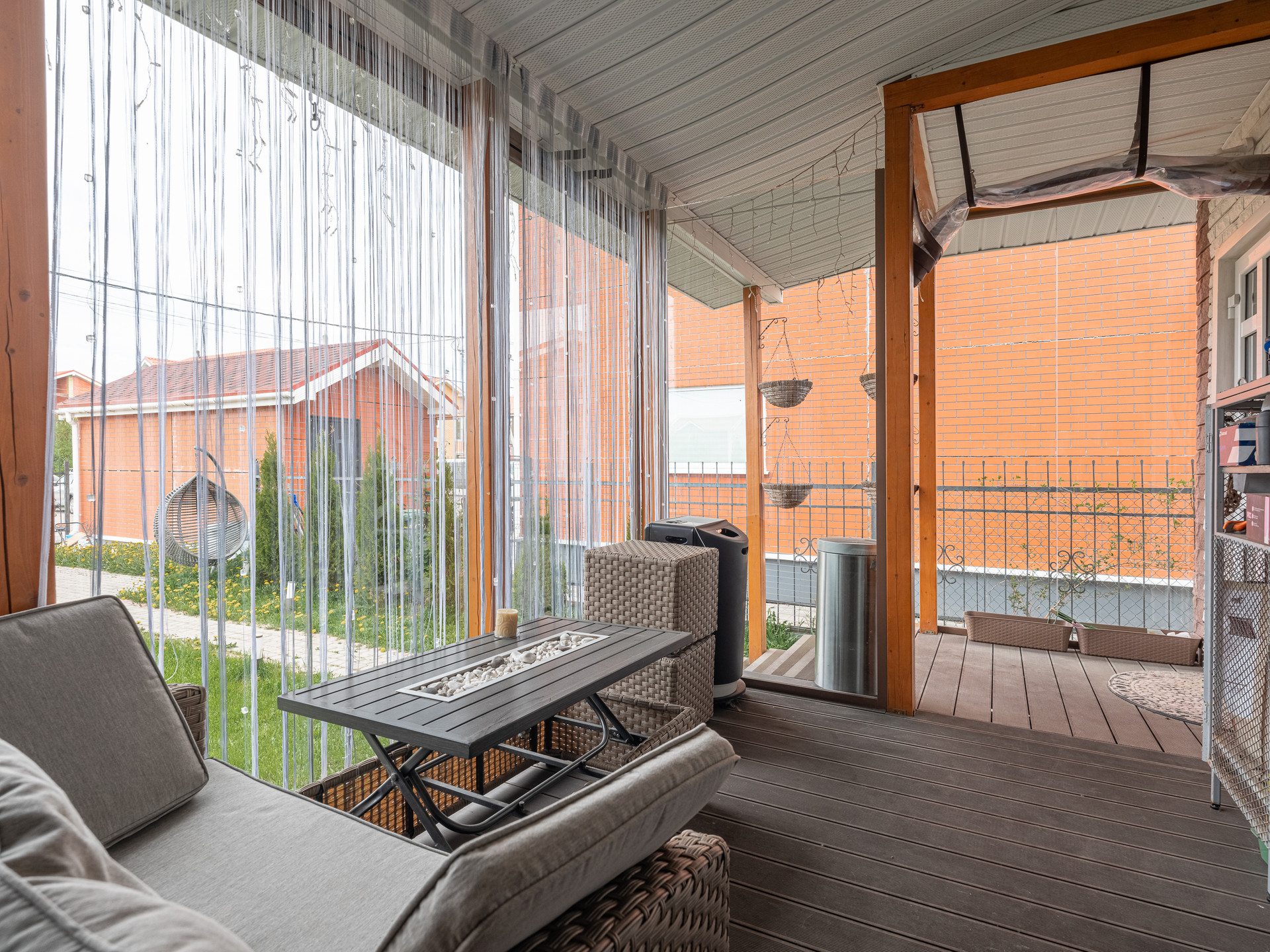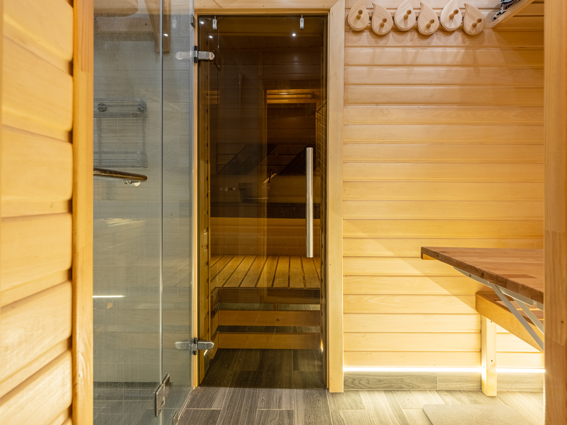 К дому пристроена терраса, на террасе сауна с душем. На террасе полностью раздвигаются окна, и терраса становится открытой.