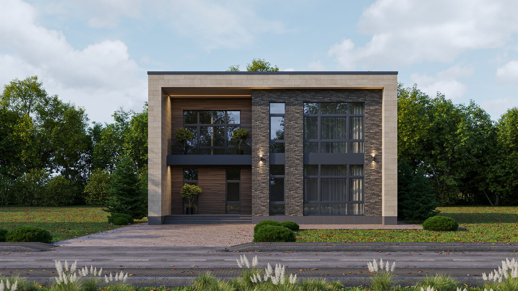 -Фасад  облицован натуральным камнем и клинкерным кирпичом  Real Brick