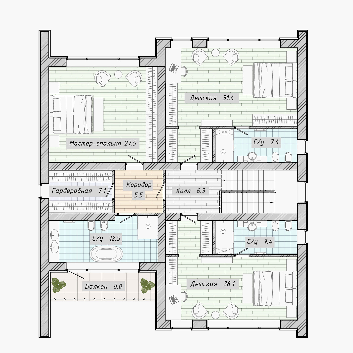 Дороги с бетонным основанием покрыты брусчаткой. Выполнен ландшафтный дизайн общей территории. Спроектирована зона для занятия спортом и детская площадка. Дома спроектированы в едином архитектурном стиле.