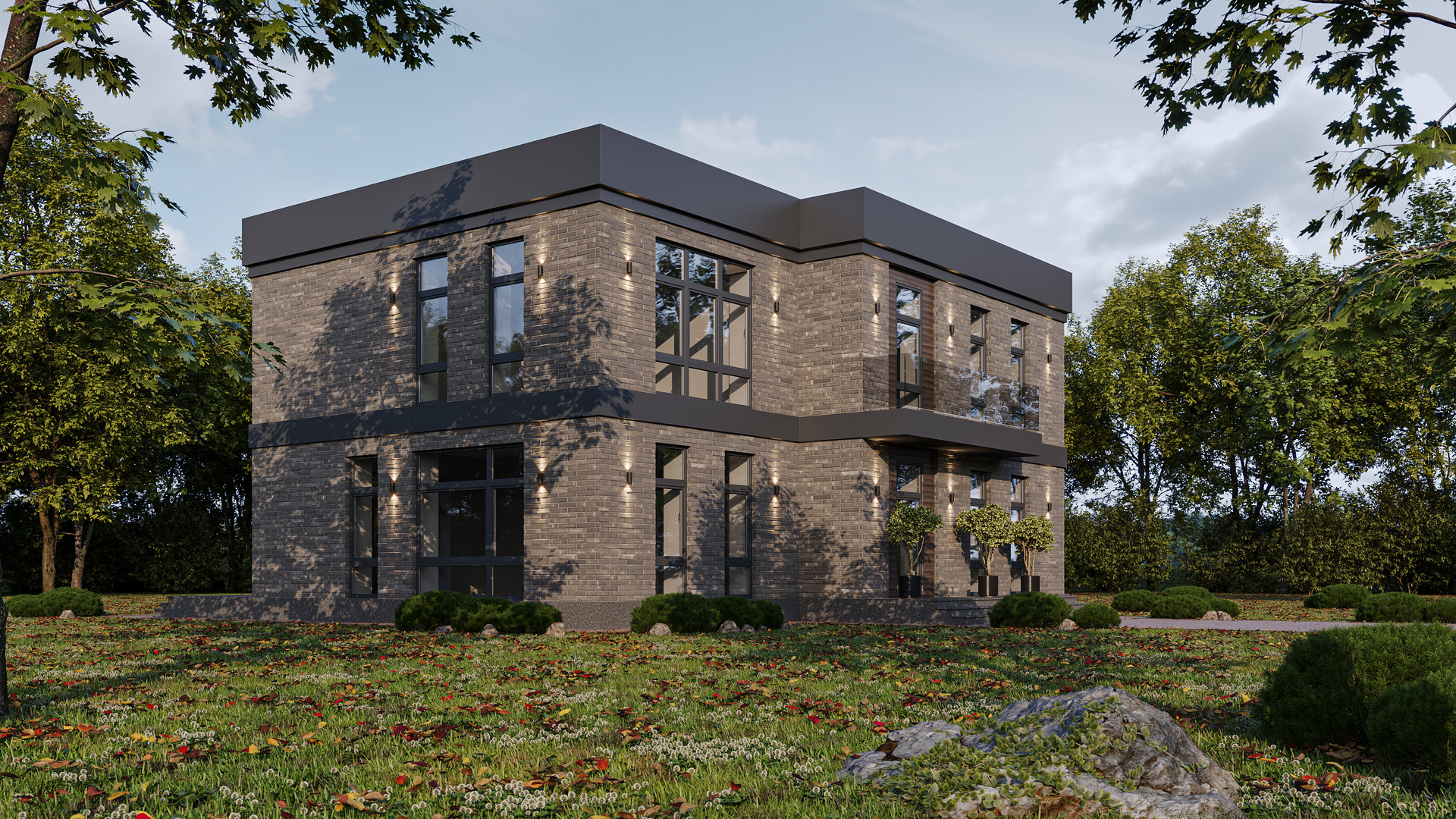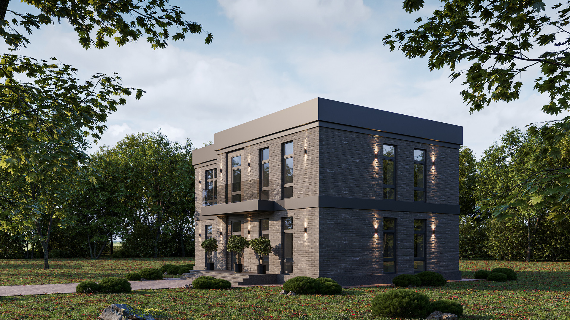 -Фасад облицован натуральным камнем и клинкерным кирпичом Real Brick
