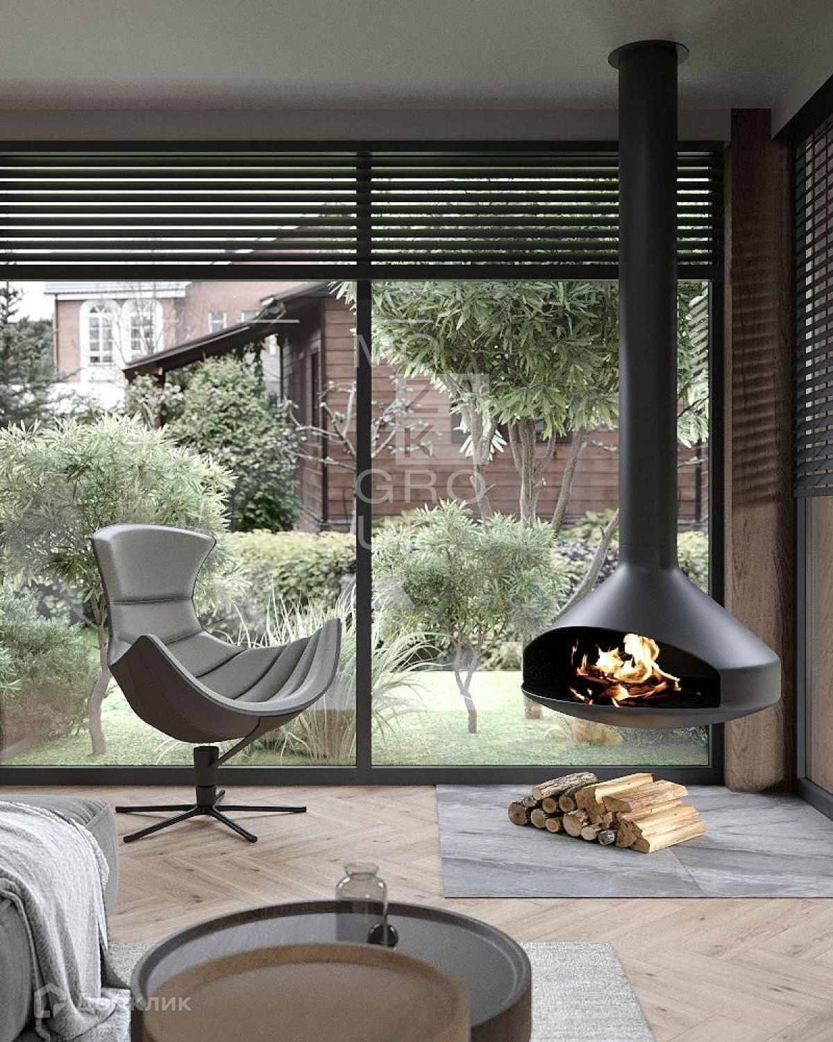 1 этаж: холл, котельная, гостевой санузел с душем, гардеробная, спальня/кабинет, постирочная, кухня-столовая гостинная с подвесным камином и выходом на патио;