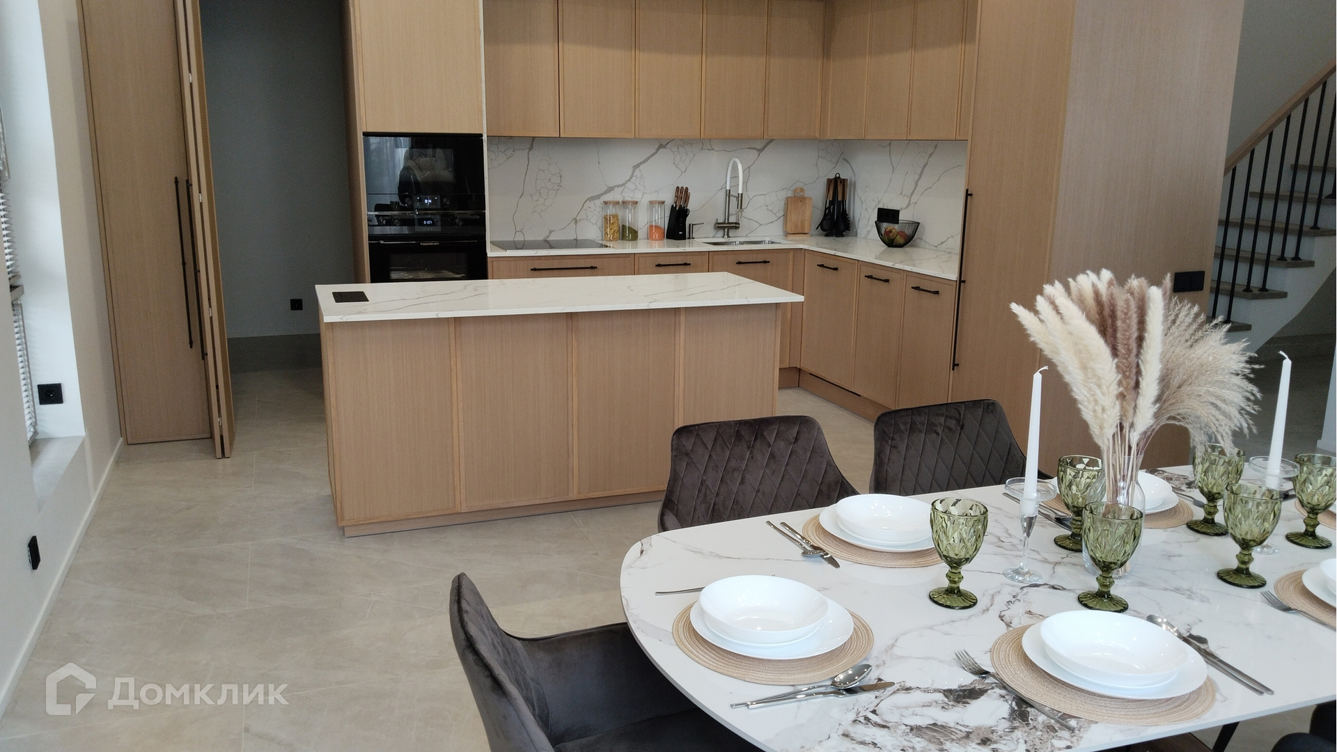 На первом этаже прихожая, гостевая спальня со своими санузлом и гардеробной комнатой, которую при желании можно оборудовать в качестве рабочего кабинета. Под лестницей размещена просторная постирочная. Кухня с кладовой, столовая с выходом на террасу и светлая гостиная. В помещении с отдельным входом расположена газовая котельная.