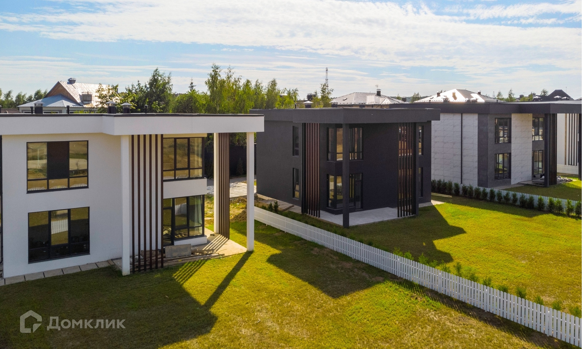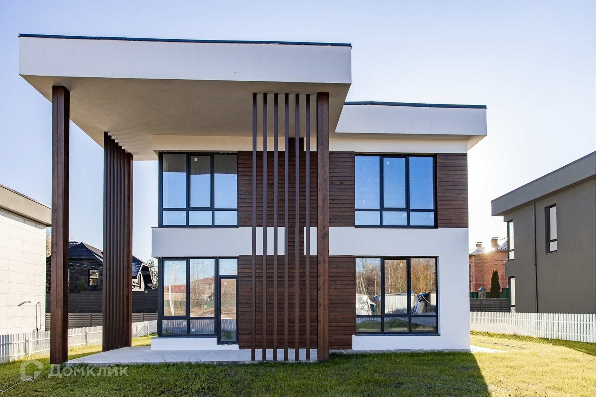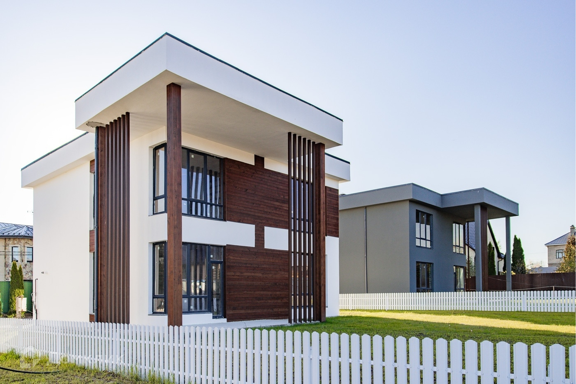 Продается новый современный коттедж 261 м2, на участке 8 соток. Экстерьер дома выполнен из сочетания декоративной штукатурки с вставками из лиственницы в светлых и темных тонах.