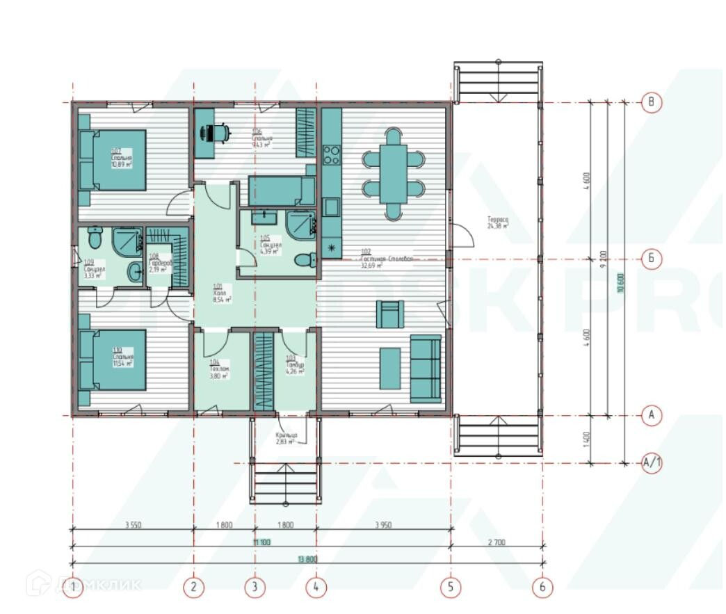 Крыльцо, тамбур, котельная, гардеробная, совмещённый санузел, три изолированные комнаты, просторная кухня-гостиная с выходом на террасу.