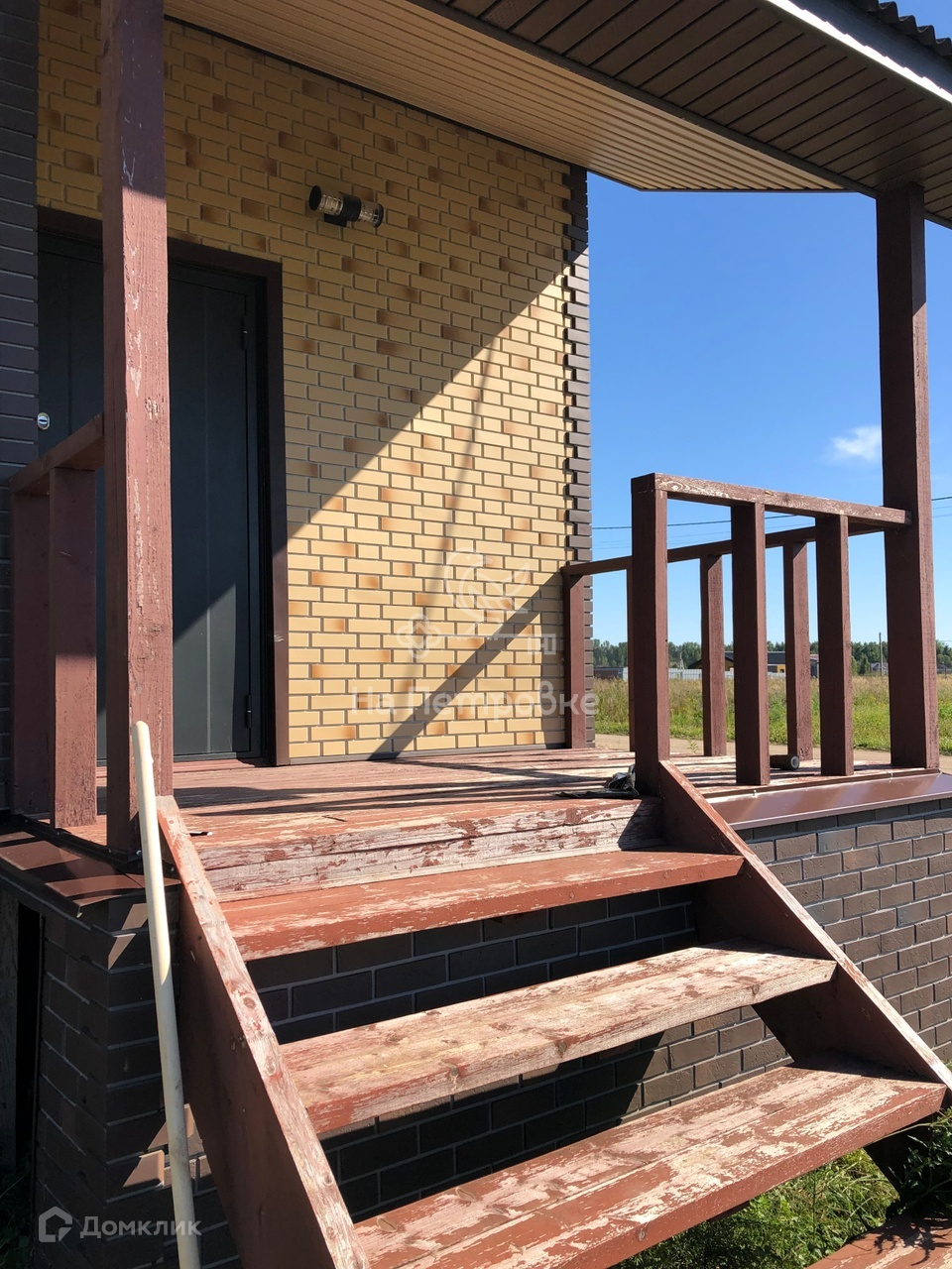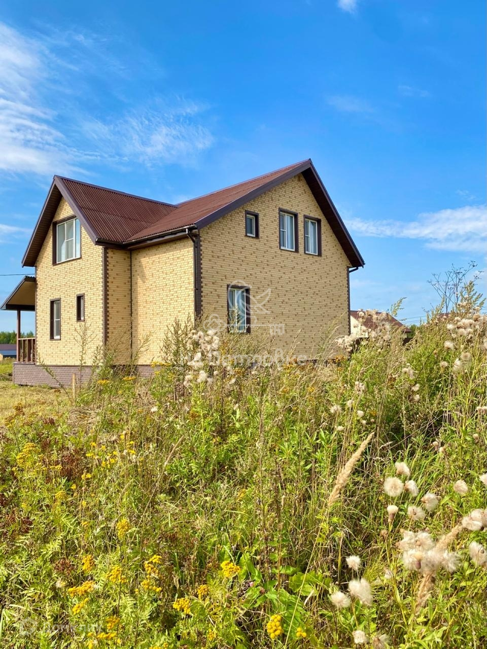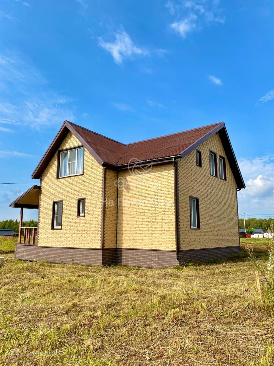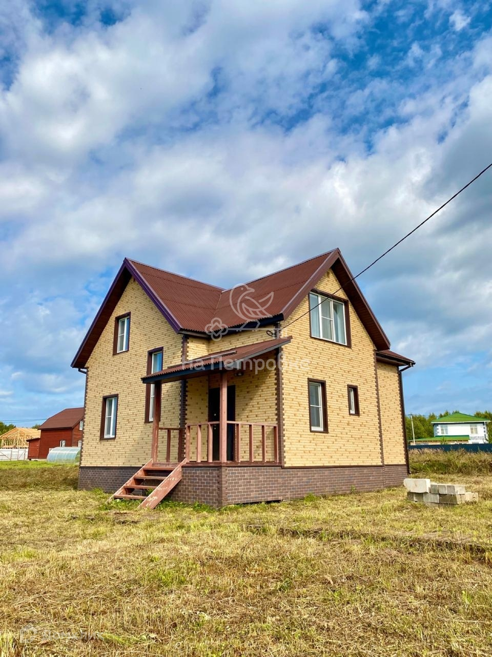 Дом построен из пеноблоков, снаружи утеплен и обшит сайдингом под кирпич. Фундамент ленточный, крыша ондулин.