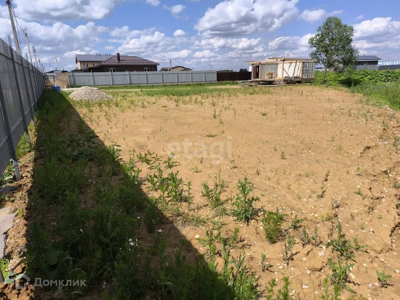 Участок практически треугольной формы.Отсыпан и выровнен под строительство. При желании можно в дальнейшем поднять плодородной почвой.Огорожен с двух сторон забором 2 метра высотой, по третьей стороне идёт пересохшее русло реки. Имеет двух непосредственных соседей по одной границе.