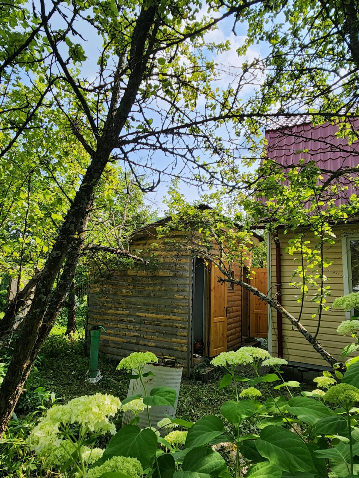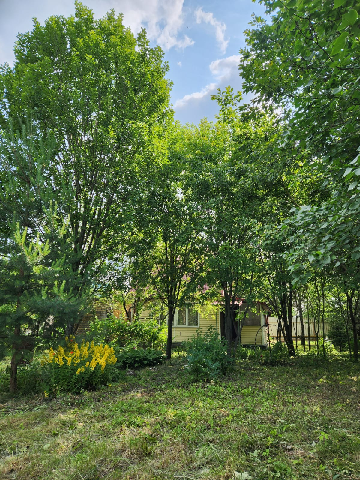 Участок с плодоносящими фруктовыми деревьями и цветами.