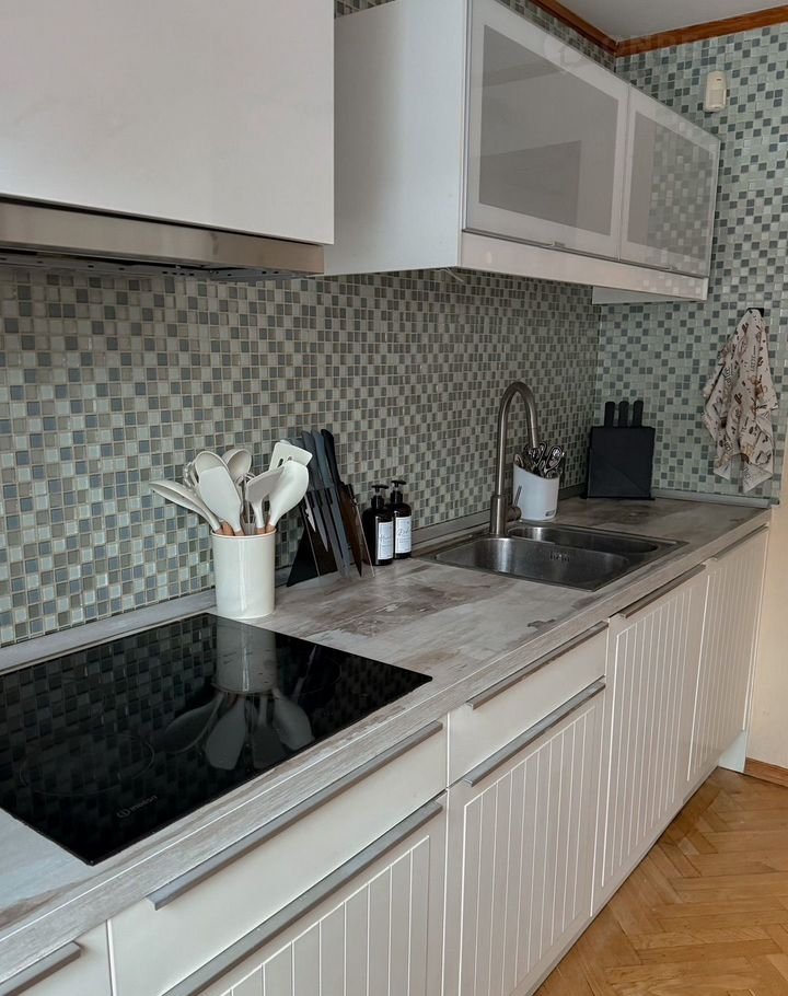 Оборудованная кухня с комплектом посуды; духовка, микроволновка и холодильник.
