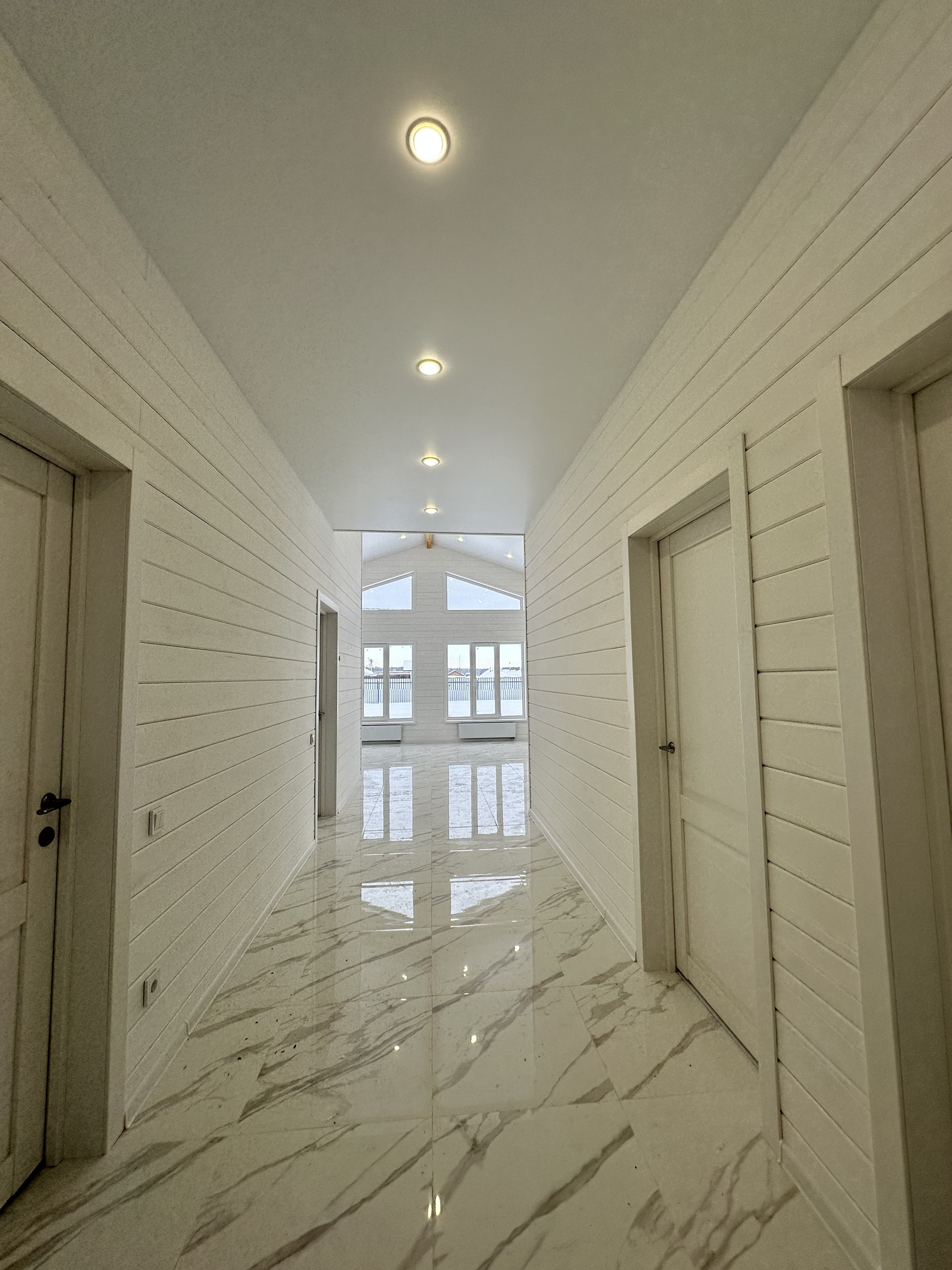 Прихожая, коридор, бойлерная, 3 спальные комнаты, 2 санузла ( в стоимость дома не входит мебель в ванных комнатах, комплект мебели для ванных можно приобрести у нас), гостиная-кухня с выходом на террасу.