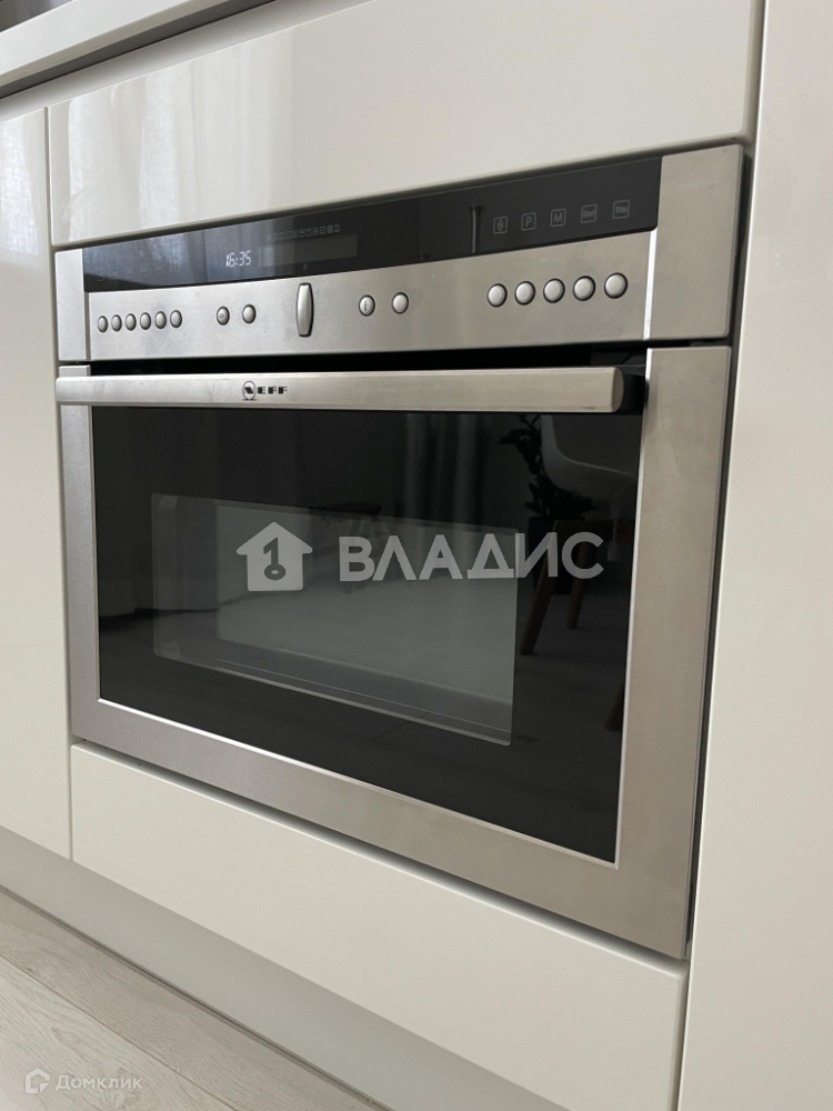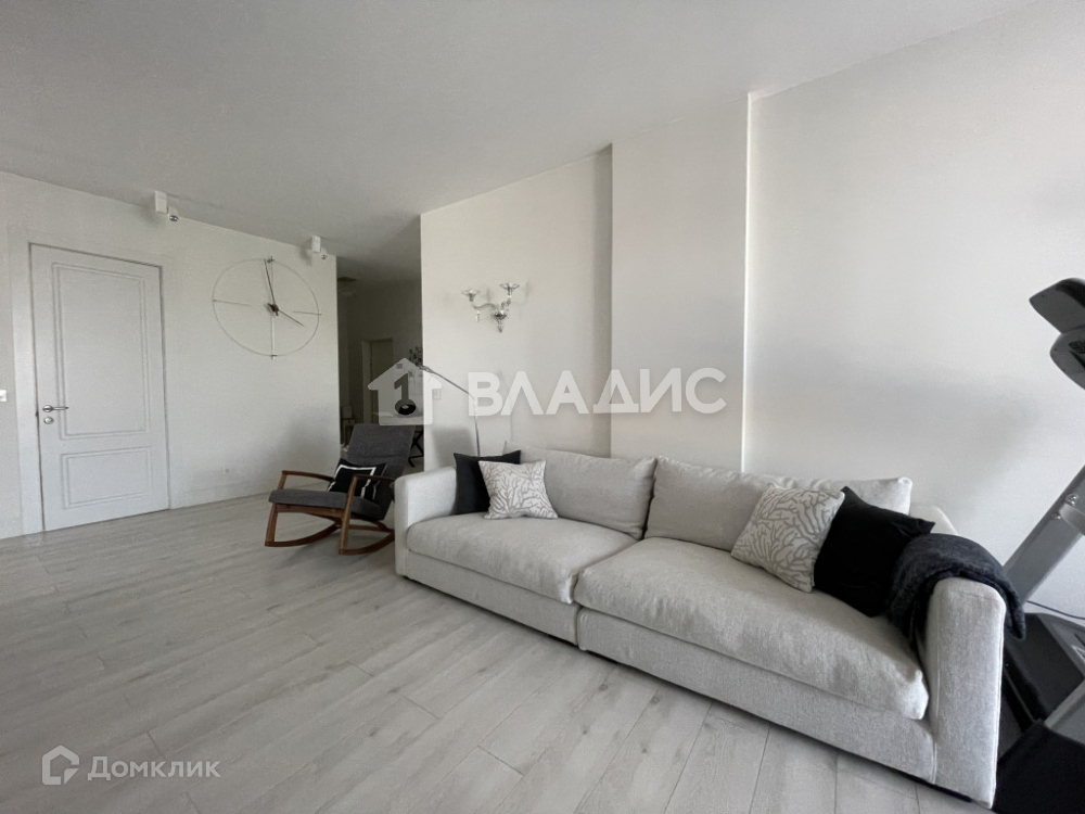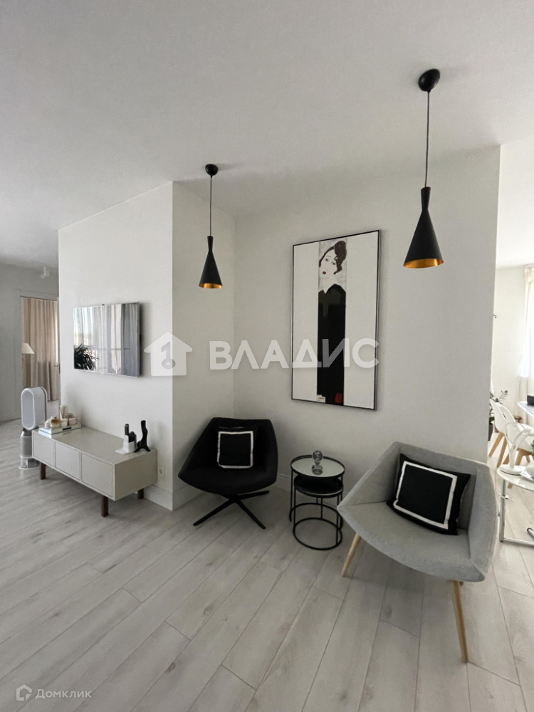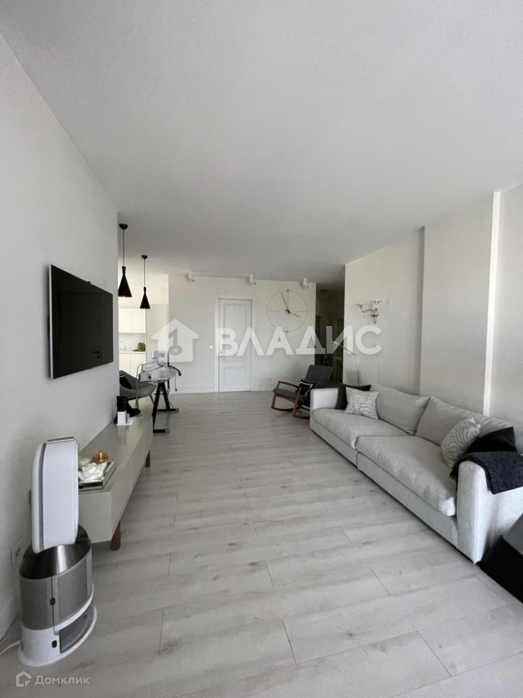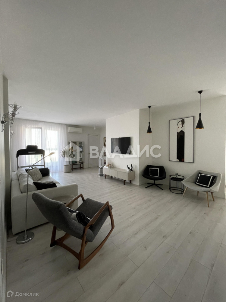 Планировка квартиры включает просторную кухню, гостиную, две спальни, санузел, гардеробную и теплую лоджию с панорамным остеклением. Отделка выполнена из высококачественных материалов. Техника на кухне Neff. Кондиционеры установлены в гостиной и кухонной зоне.