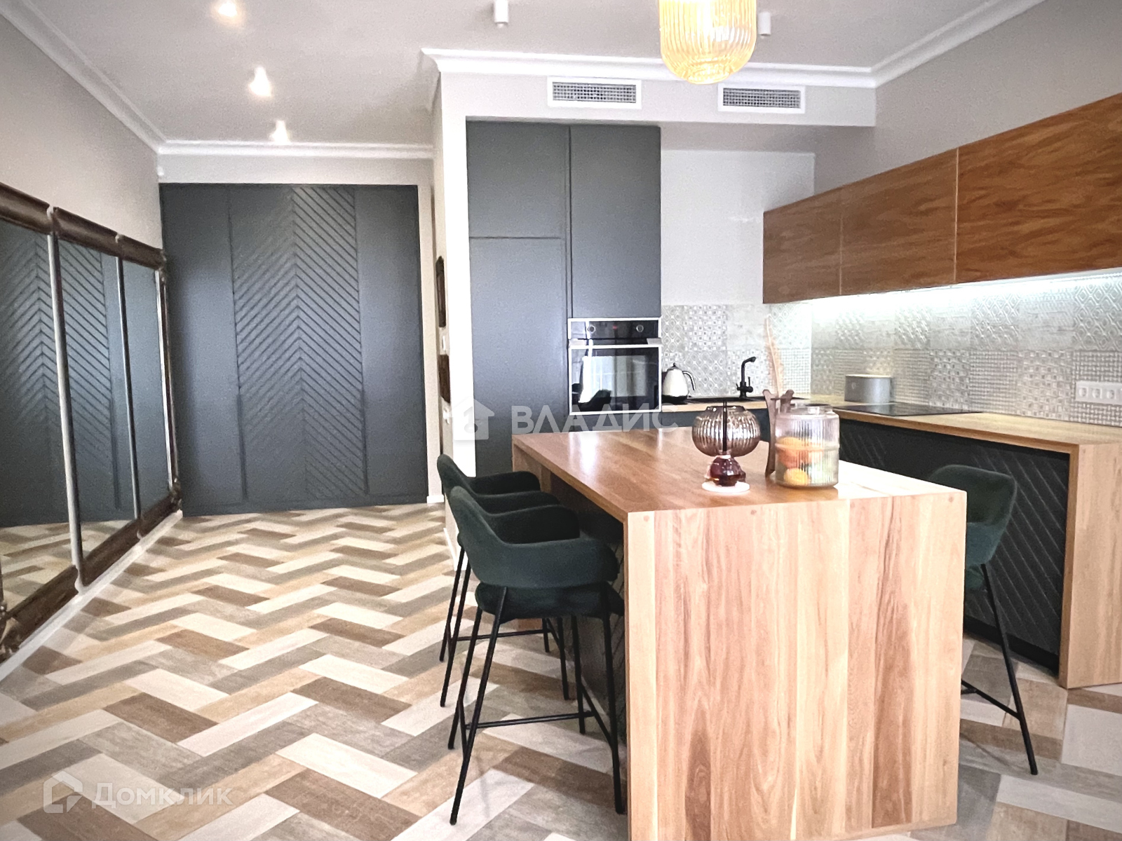 В кухне - гостиной дорогостоящий кухонный гарнитур, из массива дуба со встроенной техникой, обеденная зона с полезными местами для хранения, материал отделки дуб.