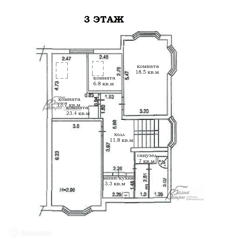 3-ий этаж: Холл 11.8 кв.м, помещение -18,5 кв.м, помещение -13,7 кв.м, помещение -6,8 кв.м, помещение -23,4 кв.м, мини-кухня-3,3 кв.м, санузел с душем и биде 6,4 кв.м,.
