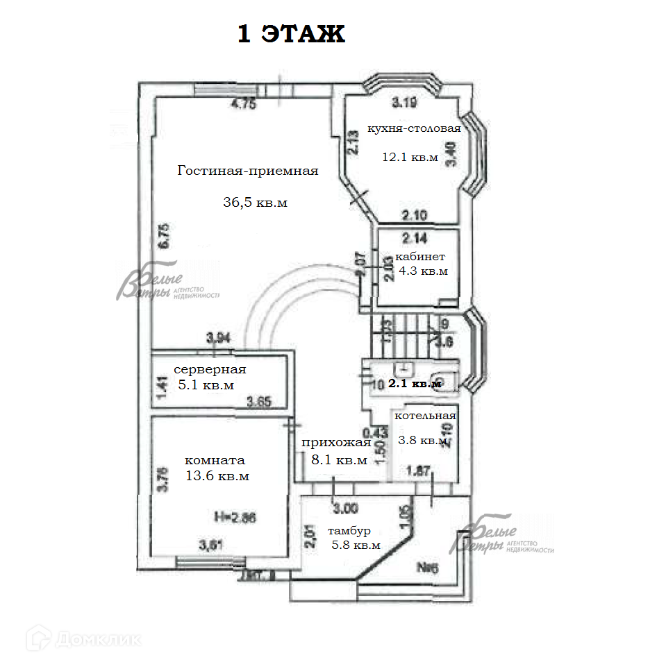 1-ый этаж: Тамбур холодный 5,8 кв.м, прихожая 8.1 кв.м, зона гостиная-приемная 36,5 кв.м с выходом террасу и на участок, кабинет-переговорная 13,6 кв.м, кухня-столовая 12,1 кв.м, помещение 4,3 кв.м, гостевой с/у 2.1 кв.м, серверная/кладовая 5,1 кв.м, котельная 3.8 кв.м..