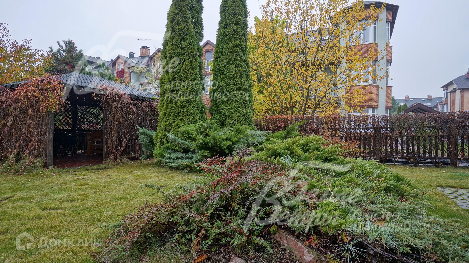 Благоустройство участка: на участке выполнен ландшафтный дизайн, высажены взрослые хвойные деревья (туи, можевельники), кустарники, живая изгородь, газон, дорожки из дикого камня. \nСтатус земли: Земли населенных пунктов для размещения коттеджной застройки, культурно-делового и спортивно-оздоровительного центра. Площадка перед входом выложена брусчаткой..