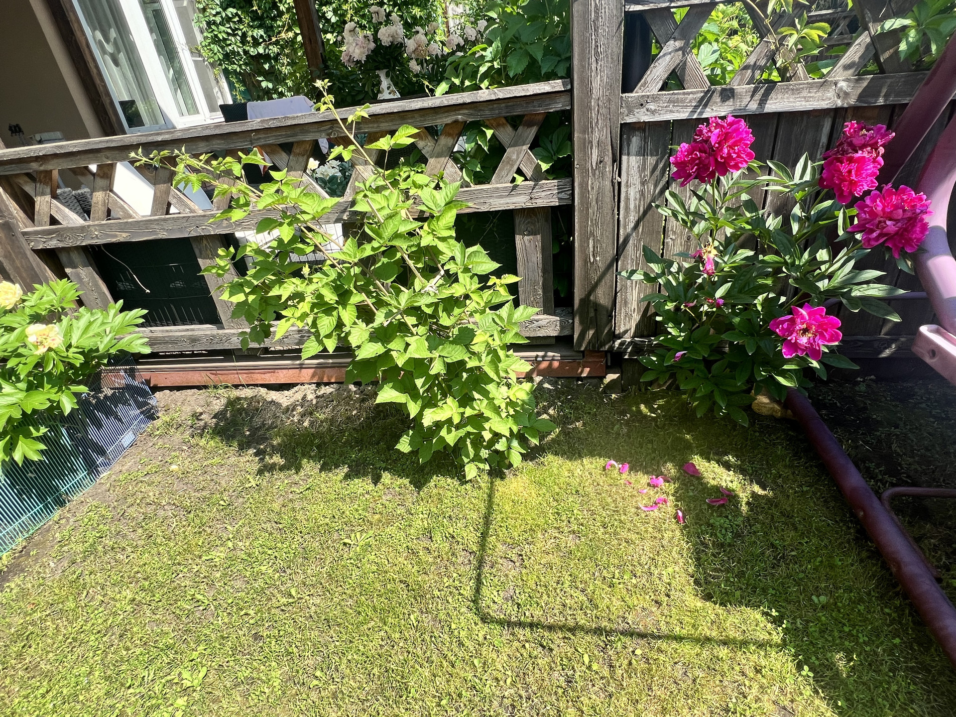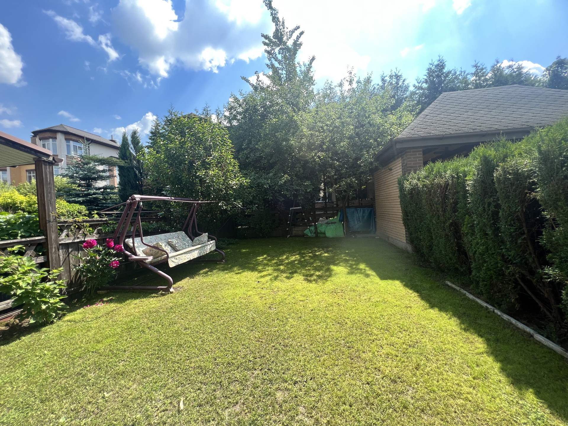 Участок ровный, правильной прямоугольной формы, ухоженный (газон), с плодовыми деревьями и кустарниками (груша, черешня, смородина и др.), цветы. Крытая парковка перед домом на 2 м.м.