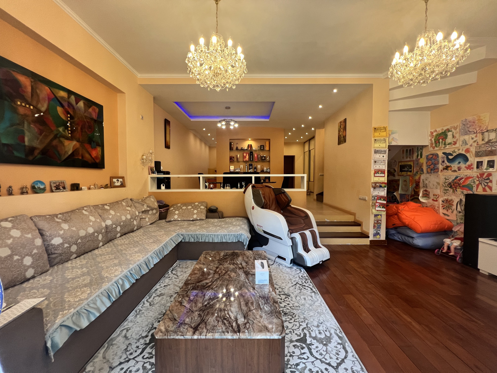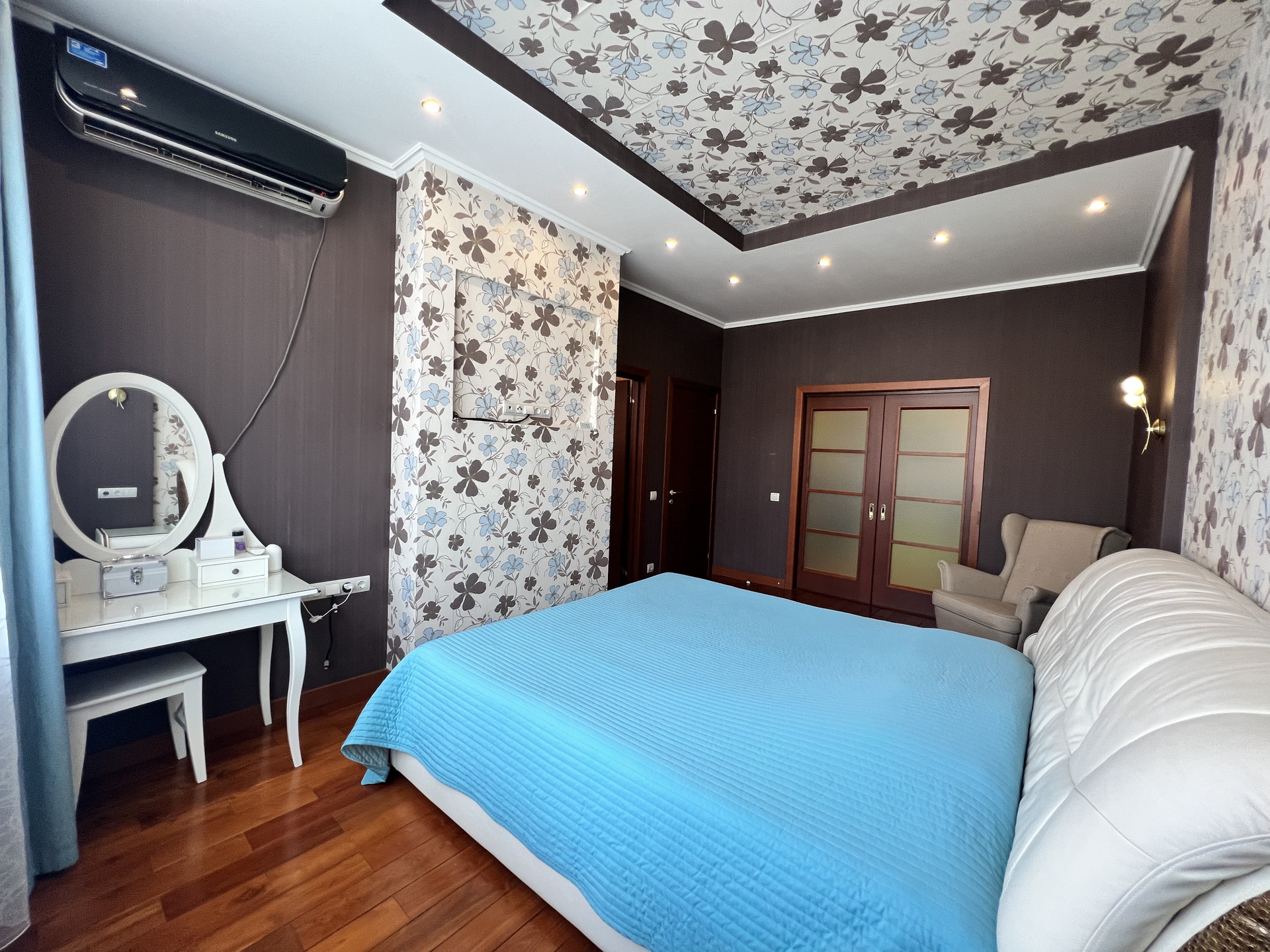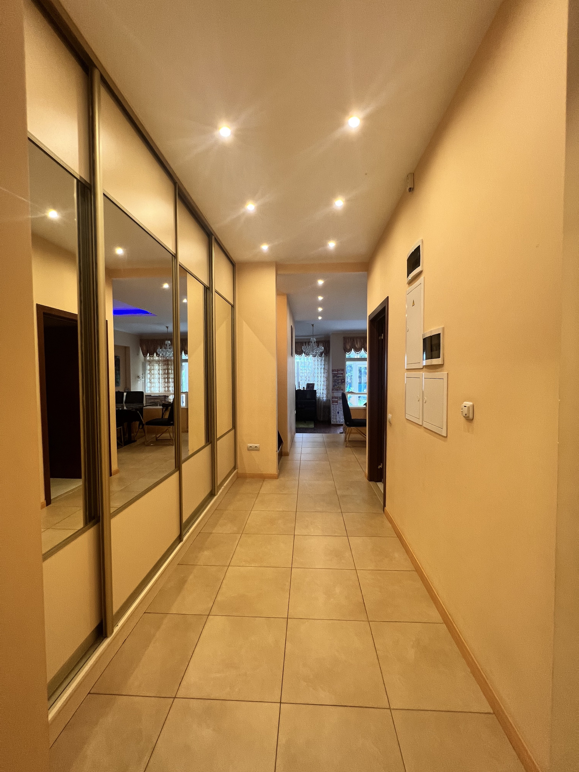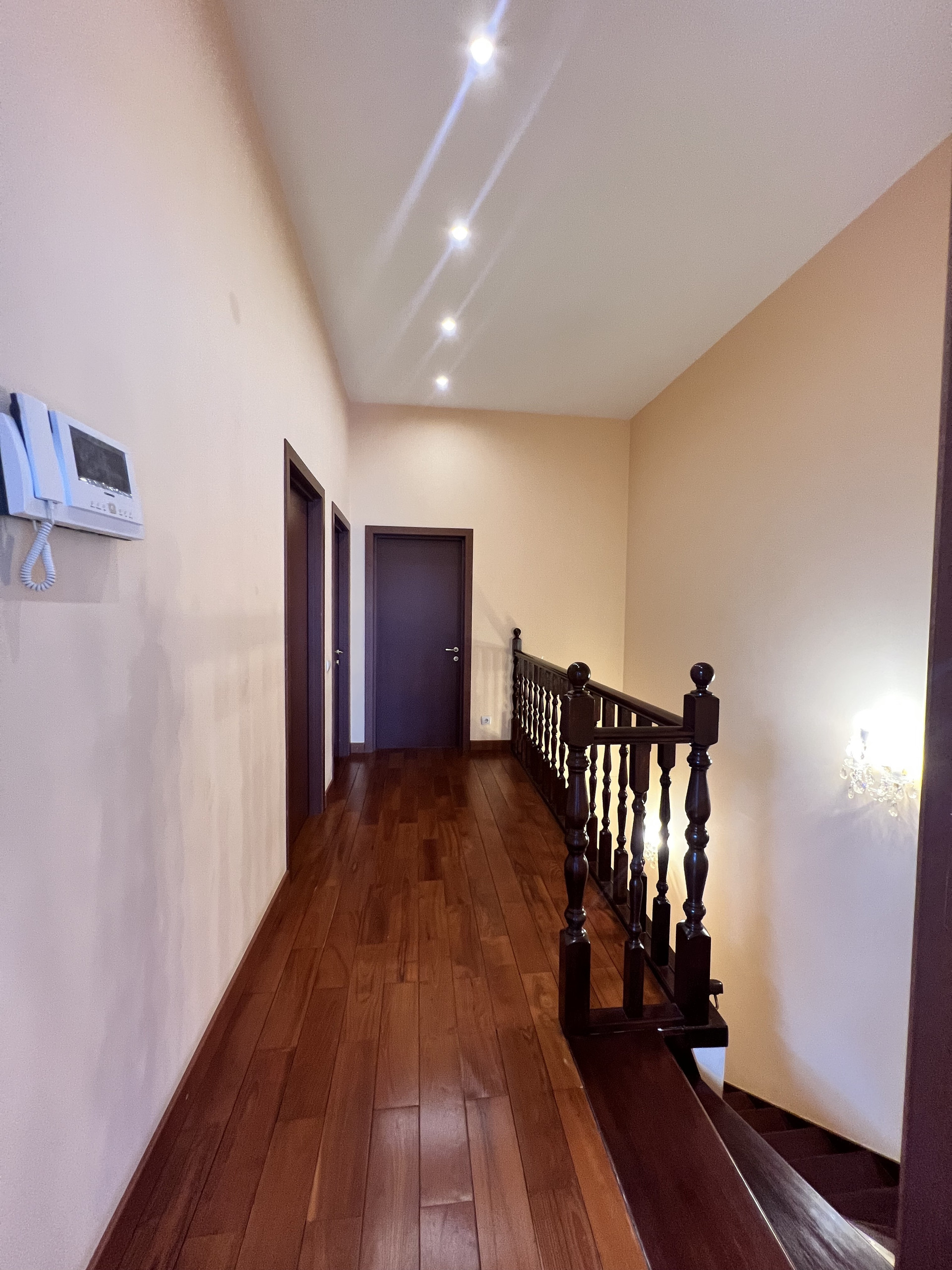 Ремонт: шумоизоляция стен, на полу во всех жилых комнатах и коридорах - массив дерева (бамбук), лестница (дуб), на 1 этаже керамическая плитка (теплый пол, водяное отопление), в с/у (электроподогрев). Установлен 1 кондиционер - в хозяйской спальне.