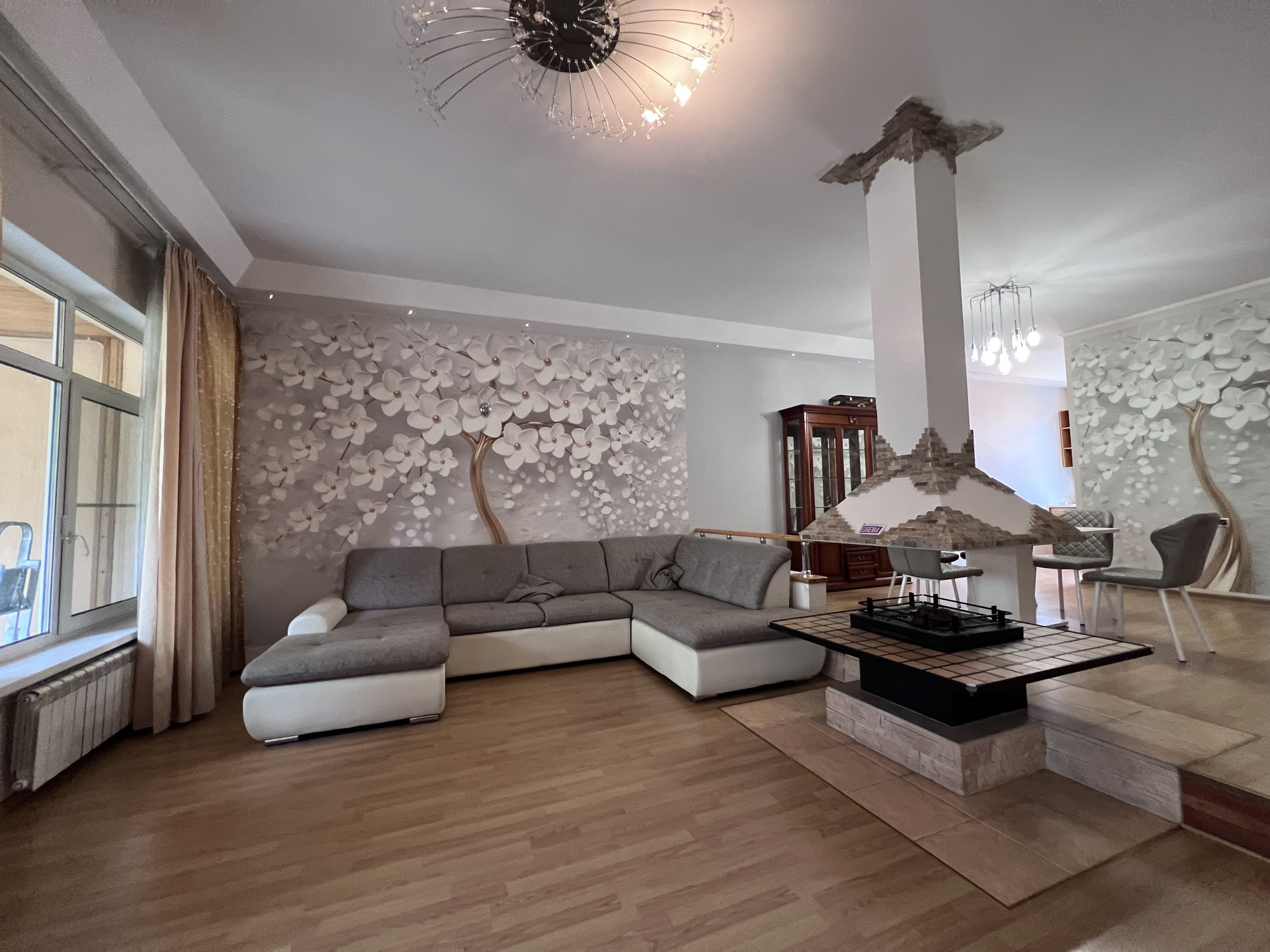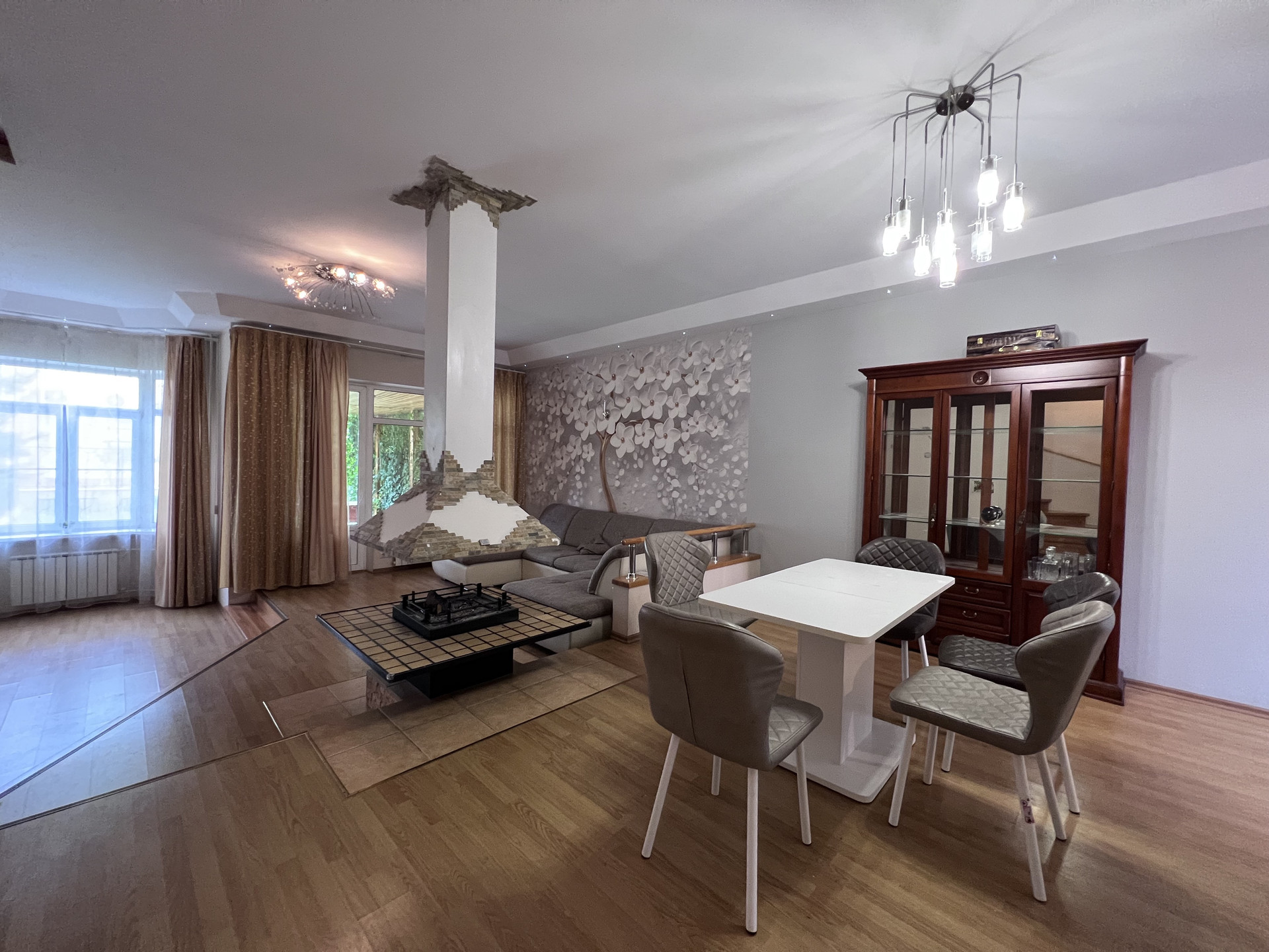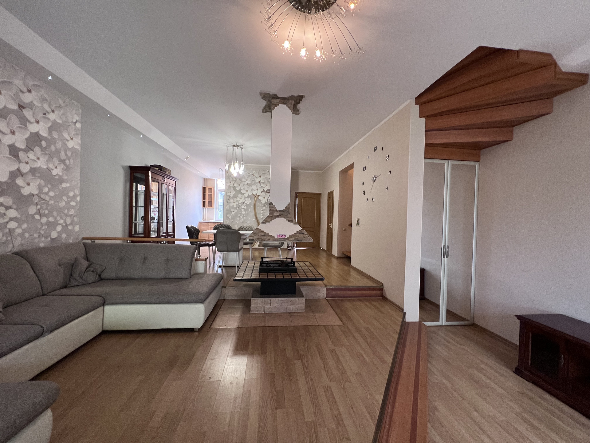 1 ЭТАЖ: тамбур со встроенным шкафом, котельная, 1 санузел, встроенная кухня со всей бытовой техникой, включая посудомоечную машину - обеденная зона-гостиная с камином (с опцией гриля), кладовка.