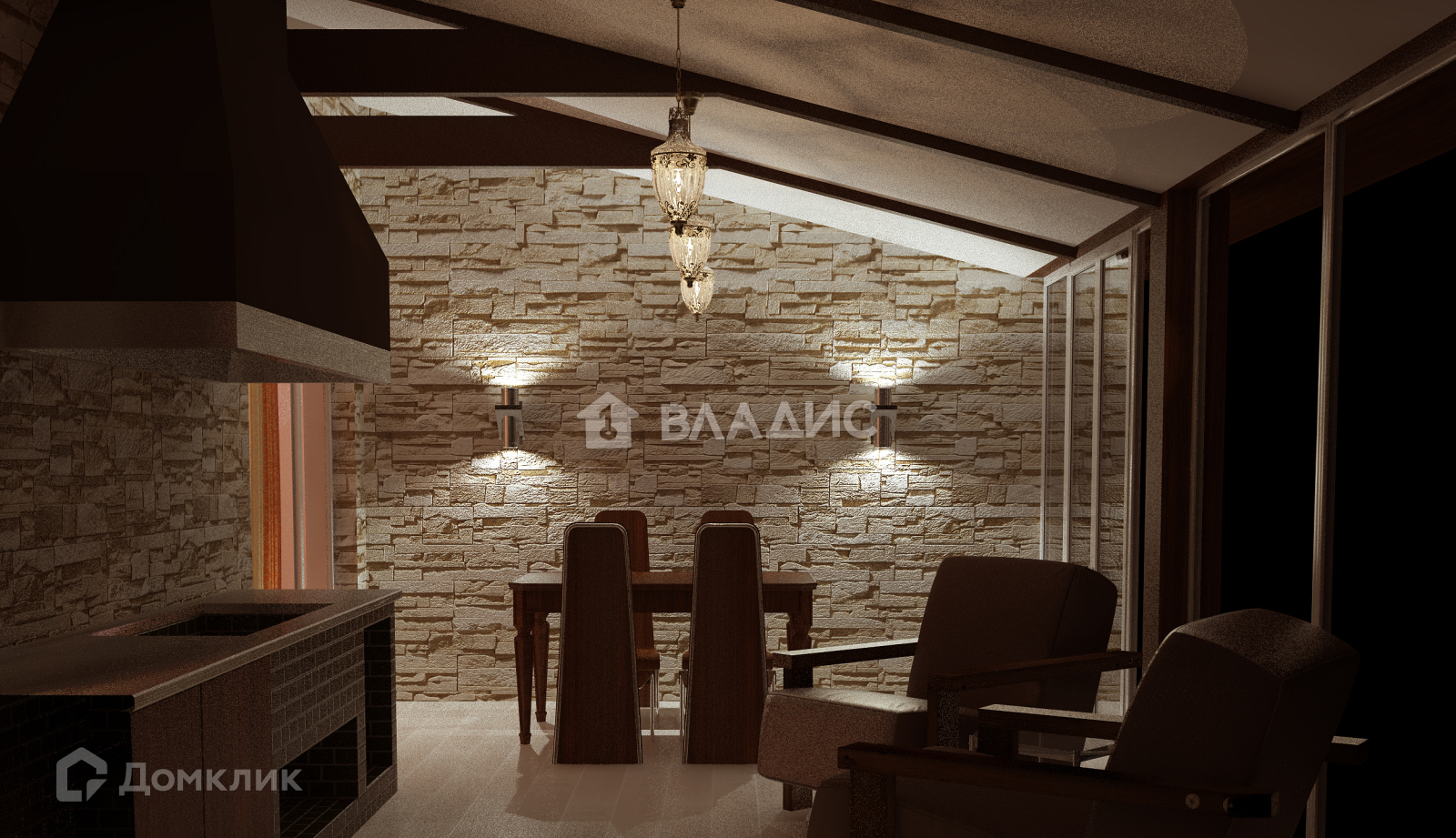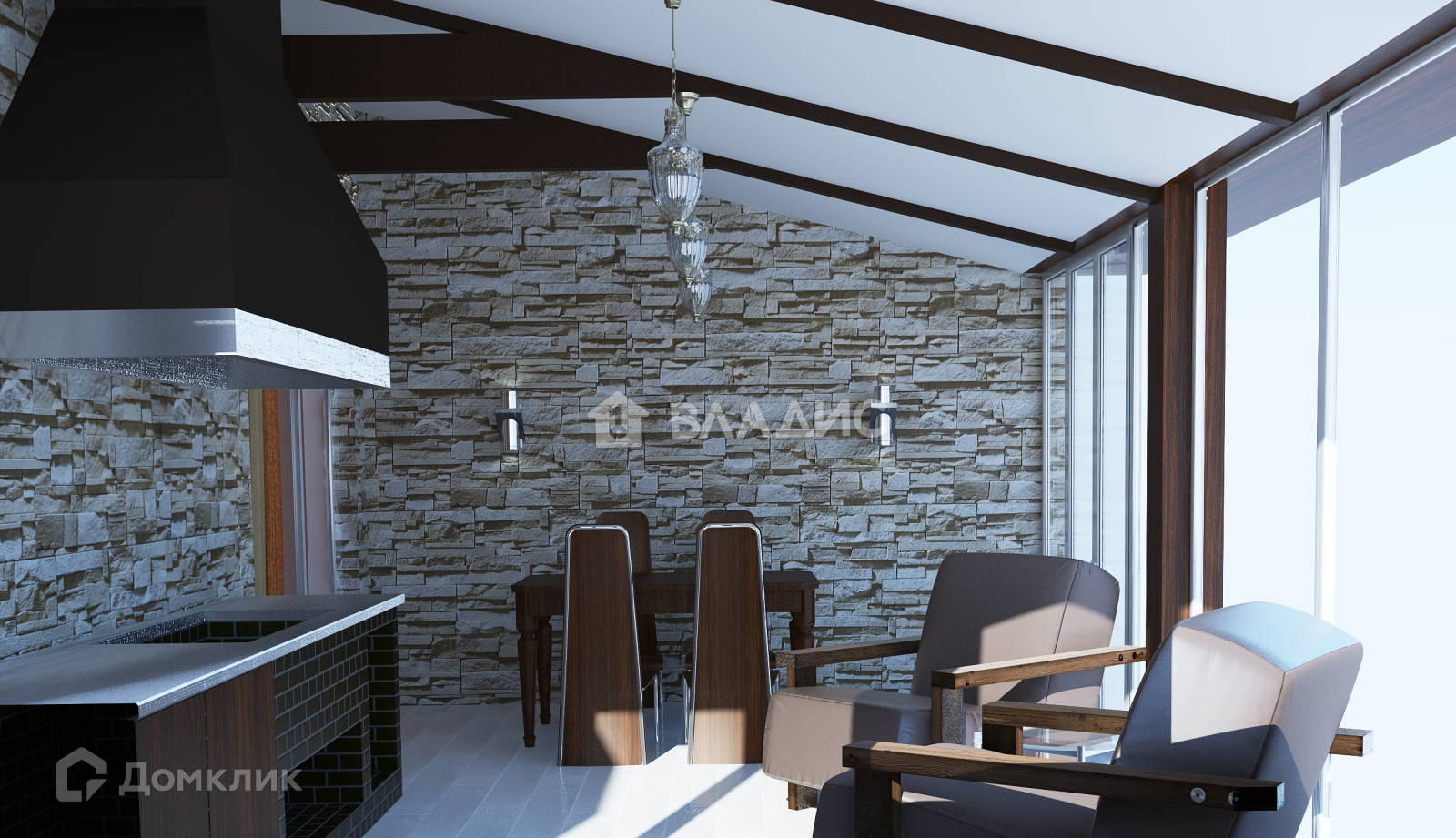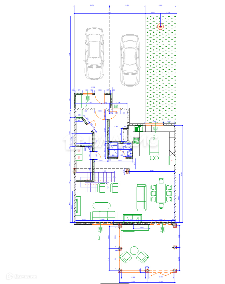 На 1-м этаже расположена прихожая, кухня-гостиная с камином и с выходом в Зимний сад, хозяйственная комната, санузел