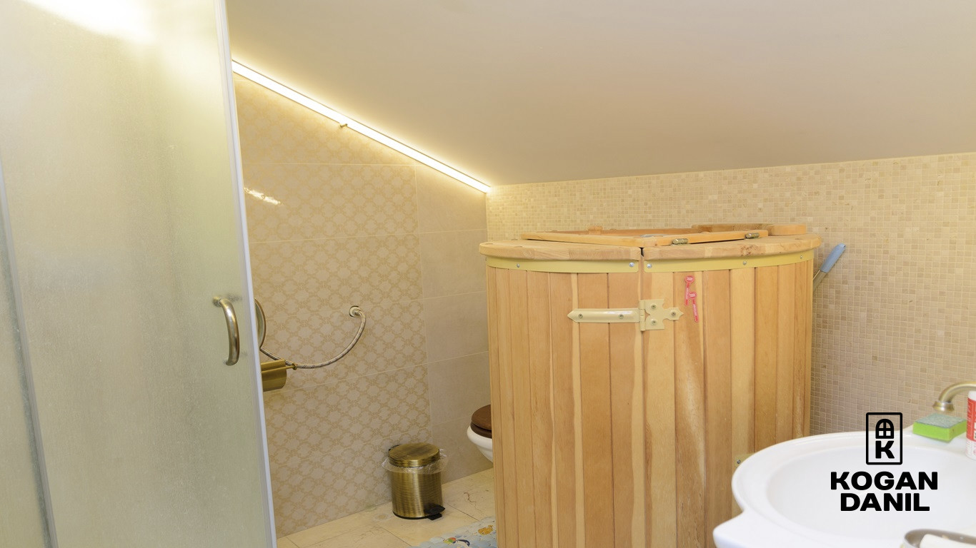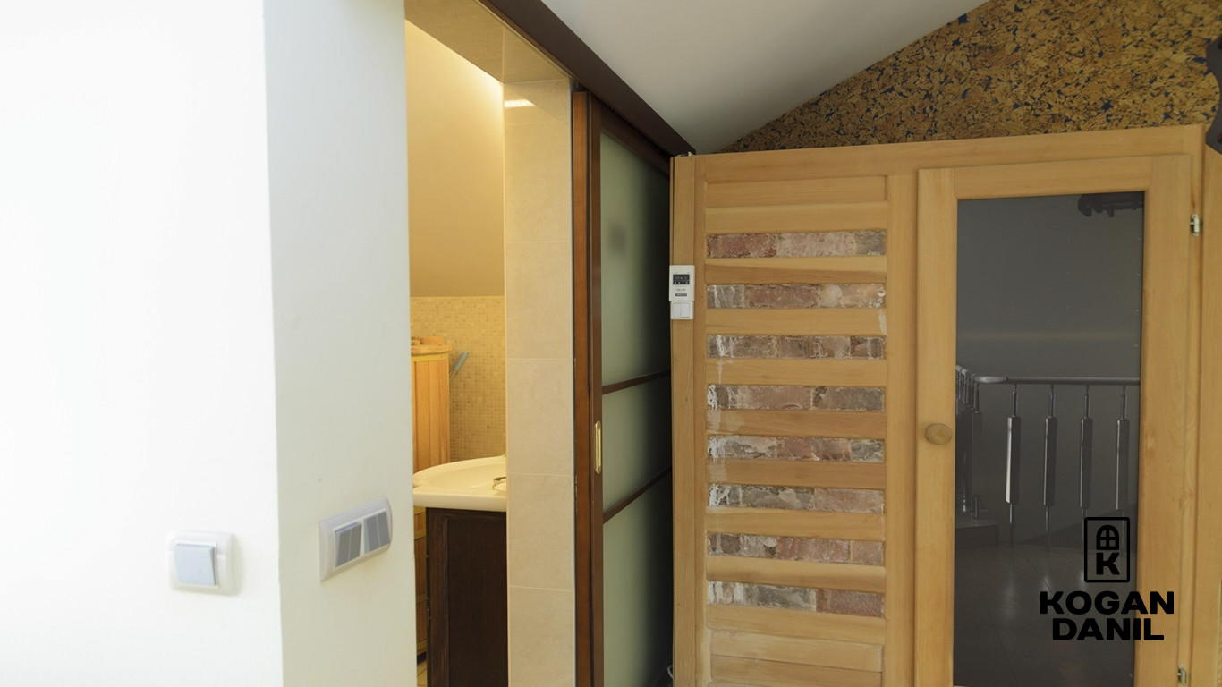 3 этаж- спальня, сан.узел, инфракрасная сауна (мебель Mr.Doors, плитка и душевая Cezares, кедровая бочка)