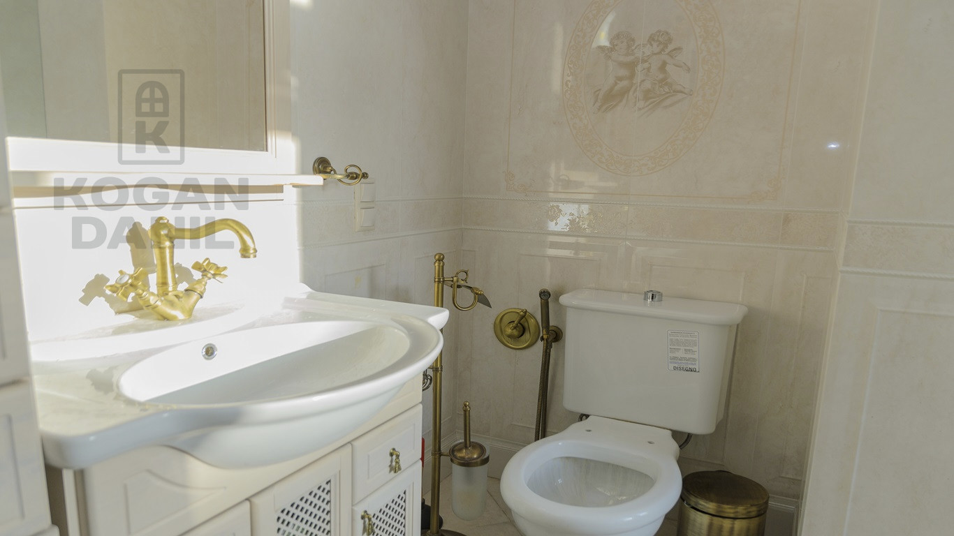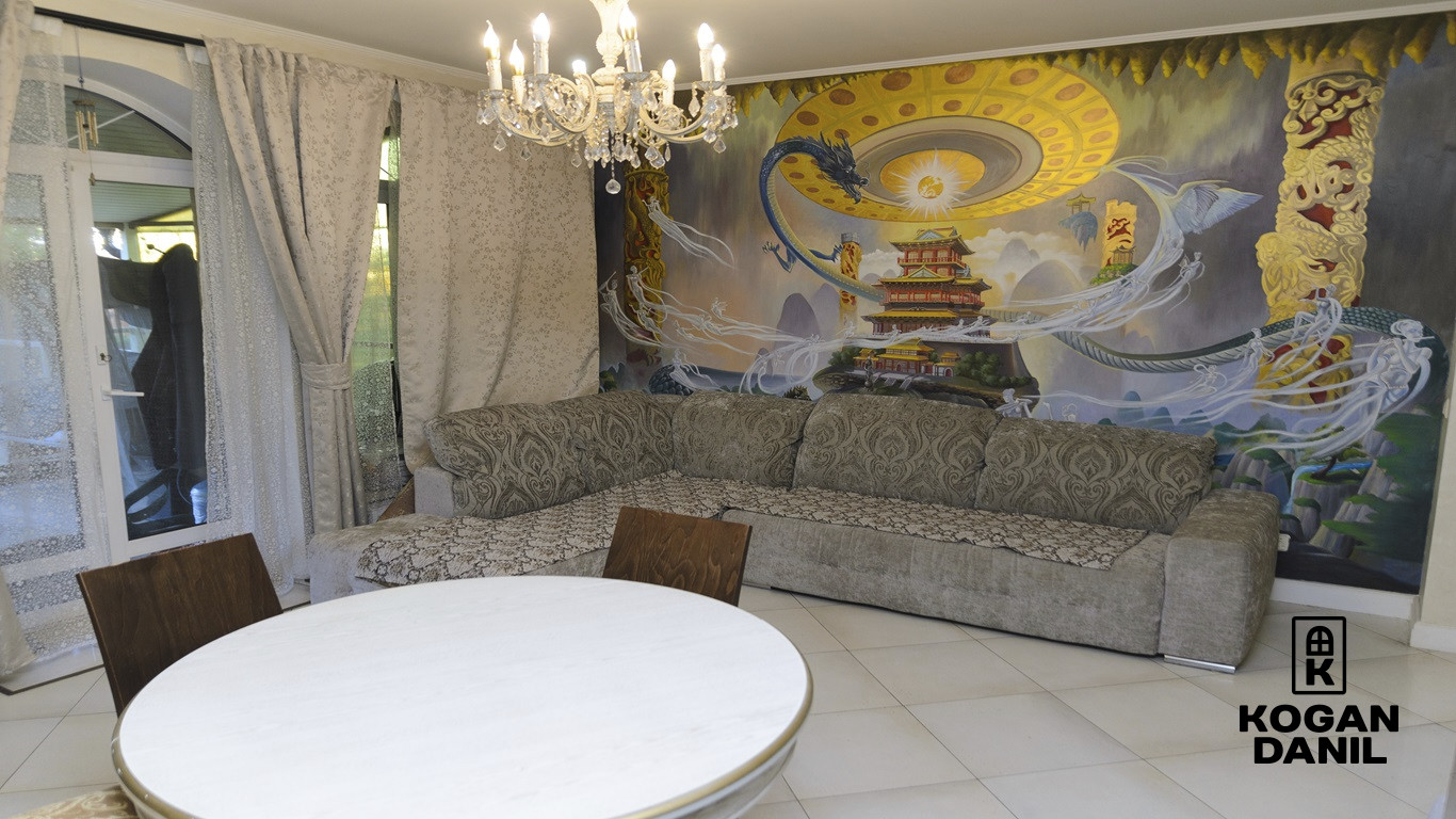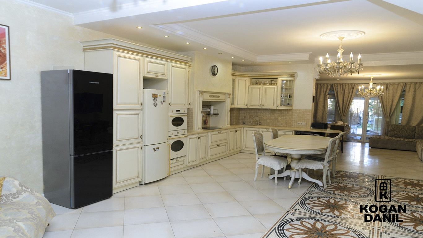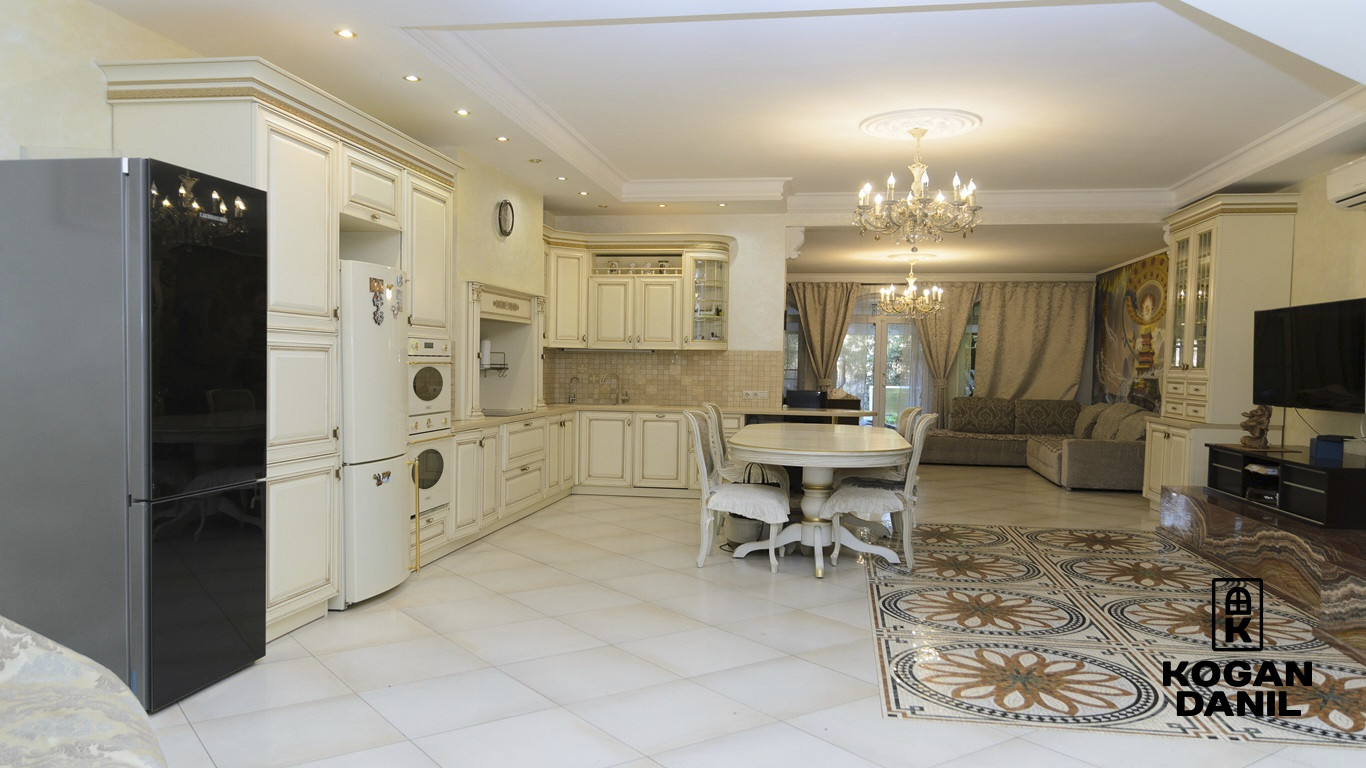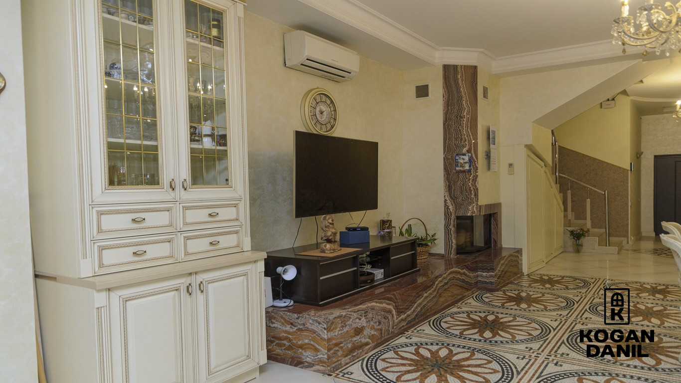 1 этаж- прихожая, кладовая, кухня, гостиная, сан. узел. (Итальянская кухня, техника SMEG, камин из камня оникс, люстры из чешского хрусталя, испанская мозаика)