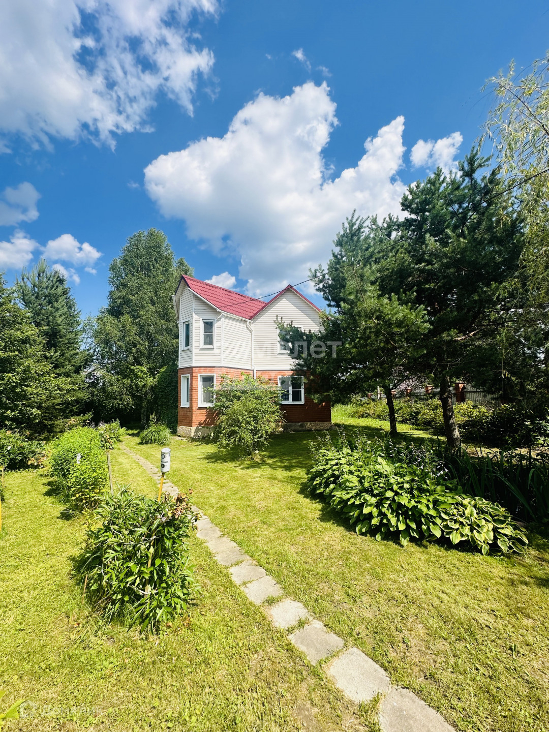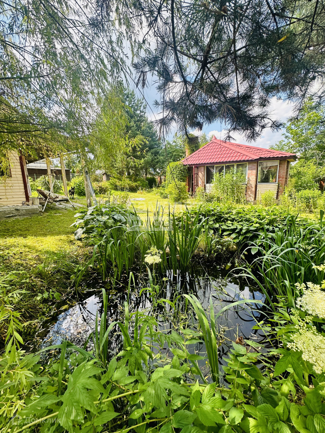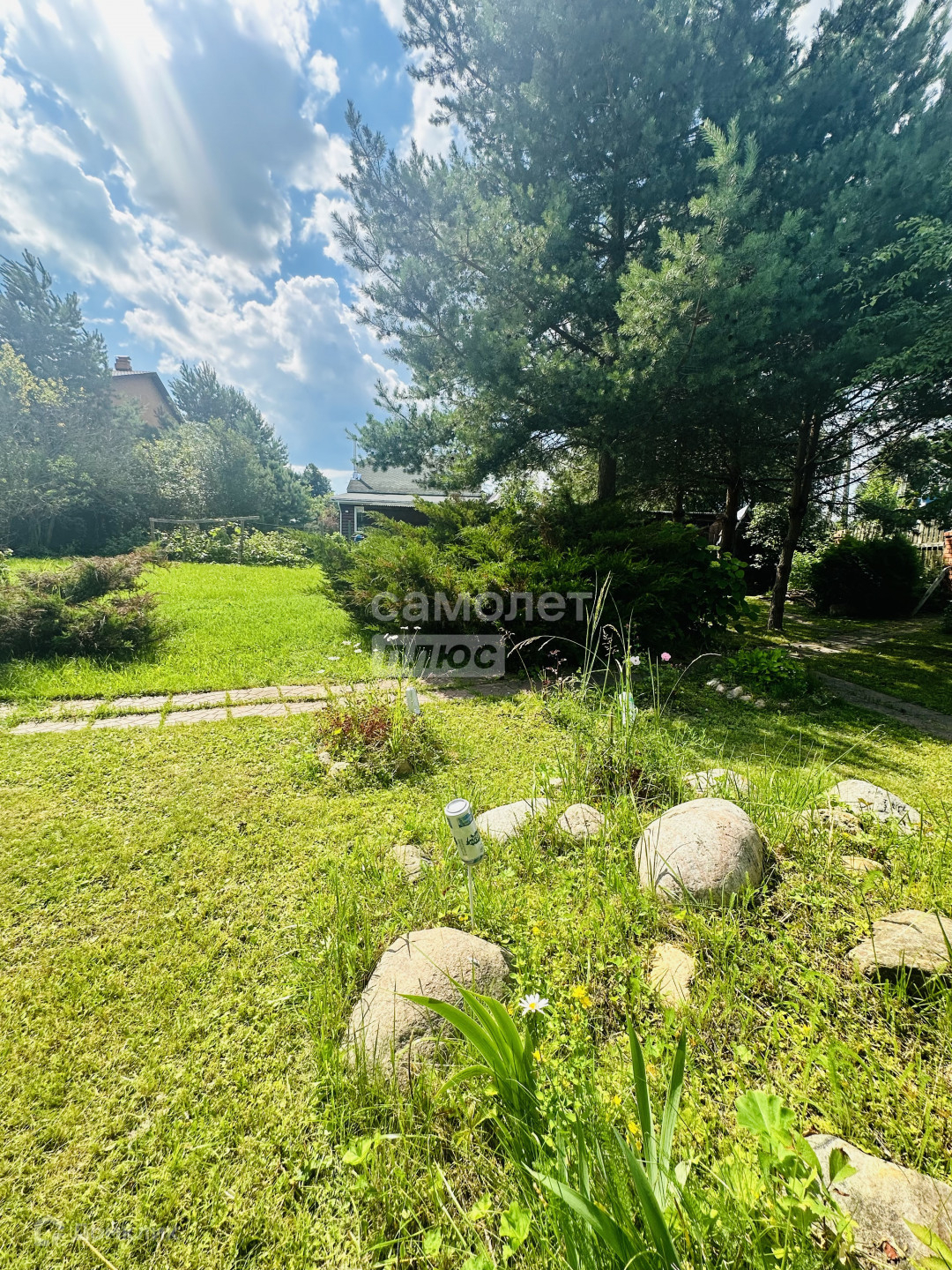 На участке растут плодовые деревья, яблони, смородина, малина, крыжовник, жимолость, виноград, хвойные деревья, цветы.