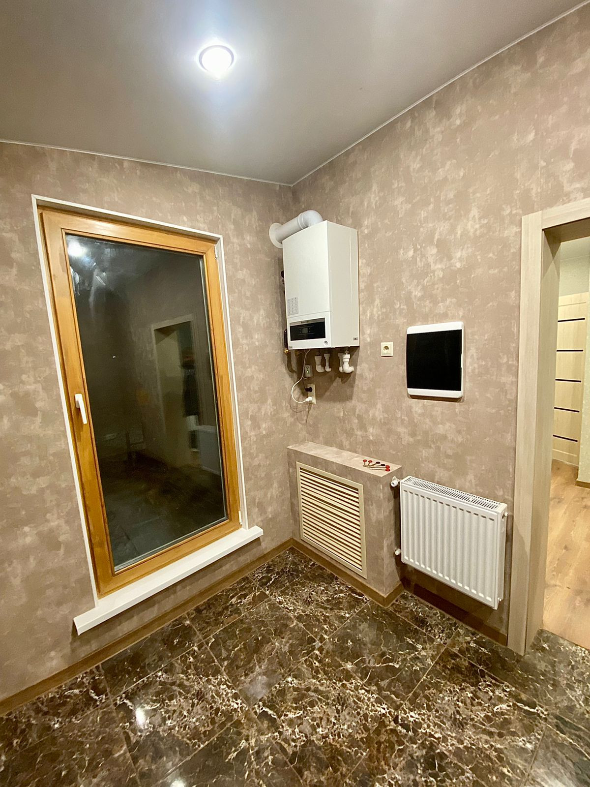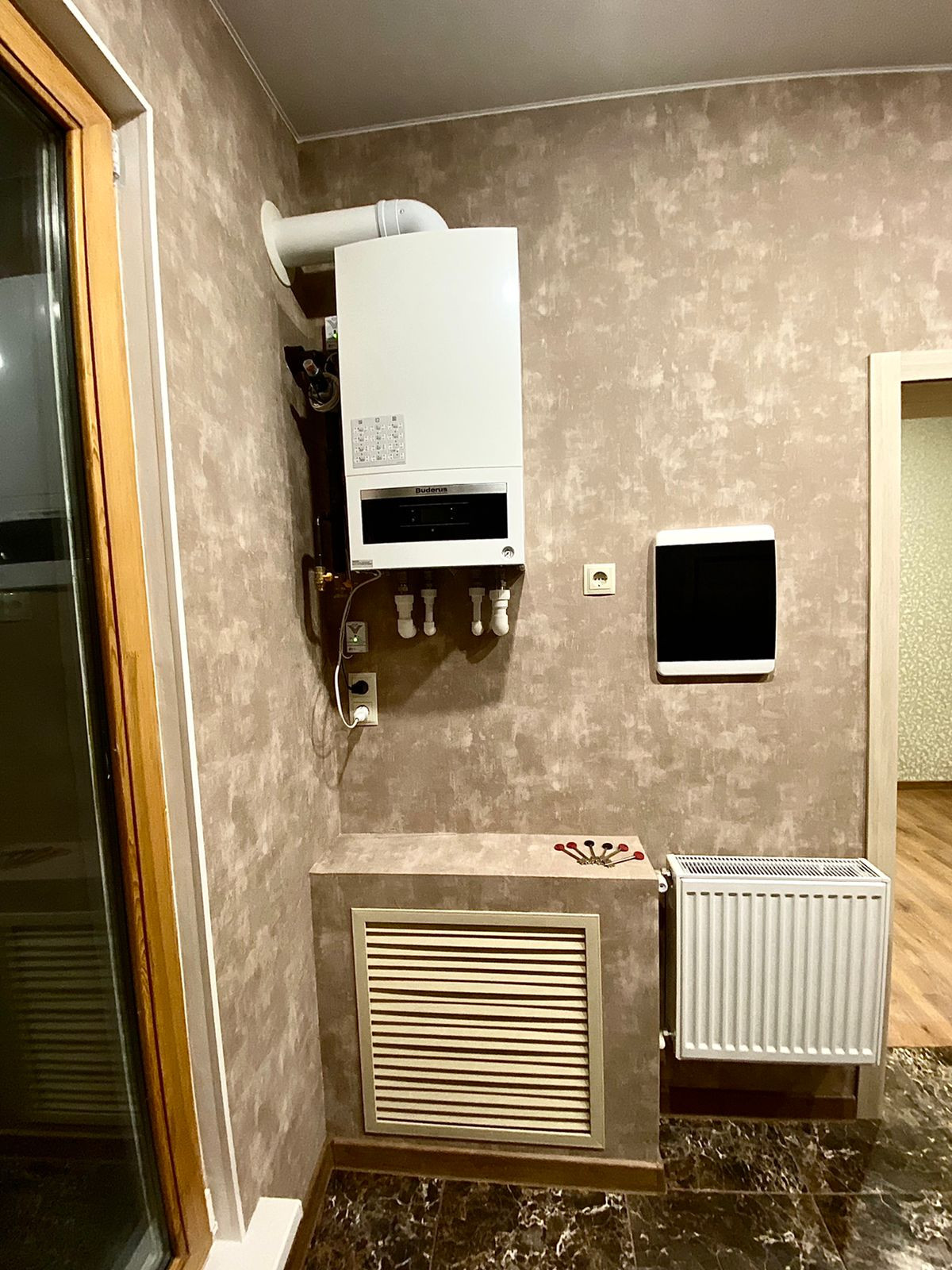 Инженерная сантехника фирмы Buderus, котёл и радиаторы.Отопление выполнено сшитым полиэтиленом без соединений от коллектора до радиатора,что исключает любые протечки.