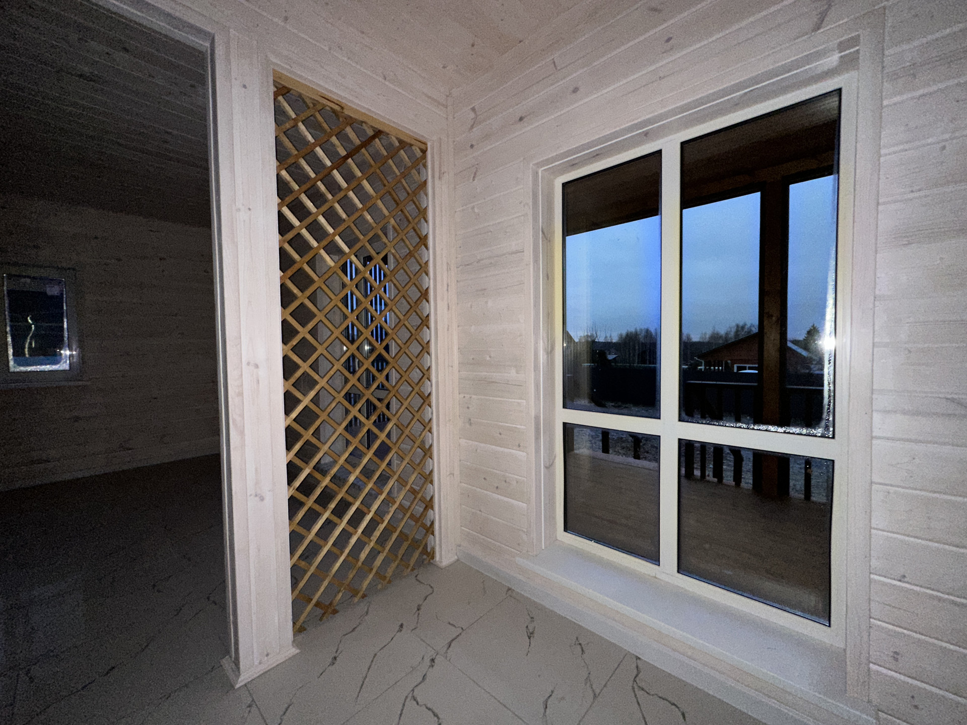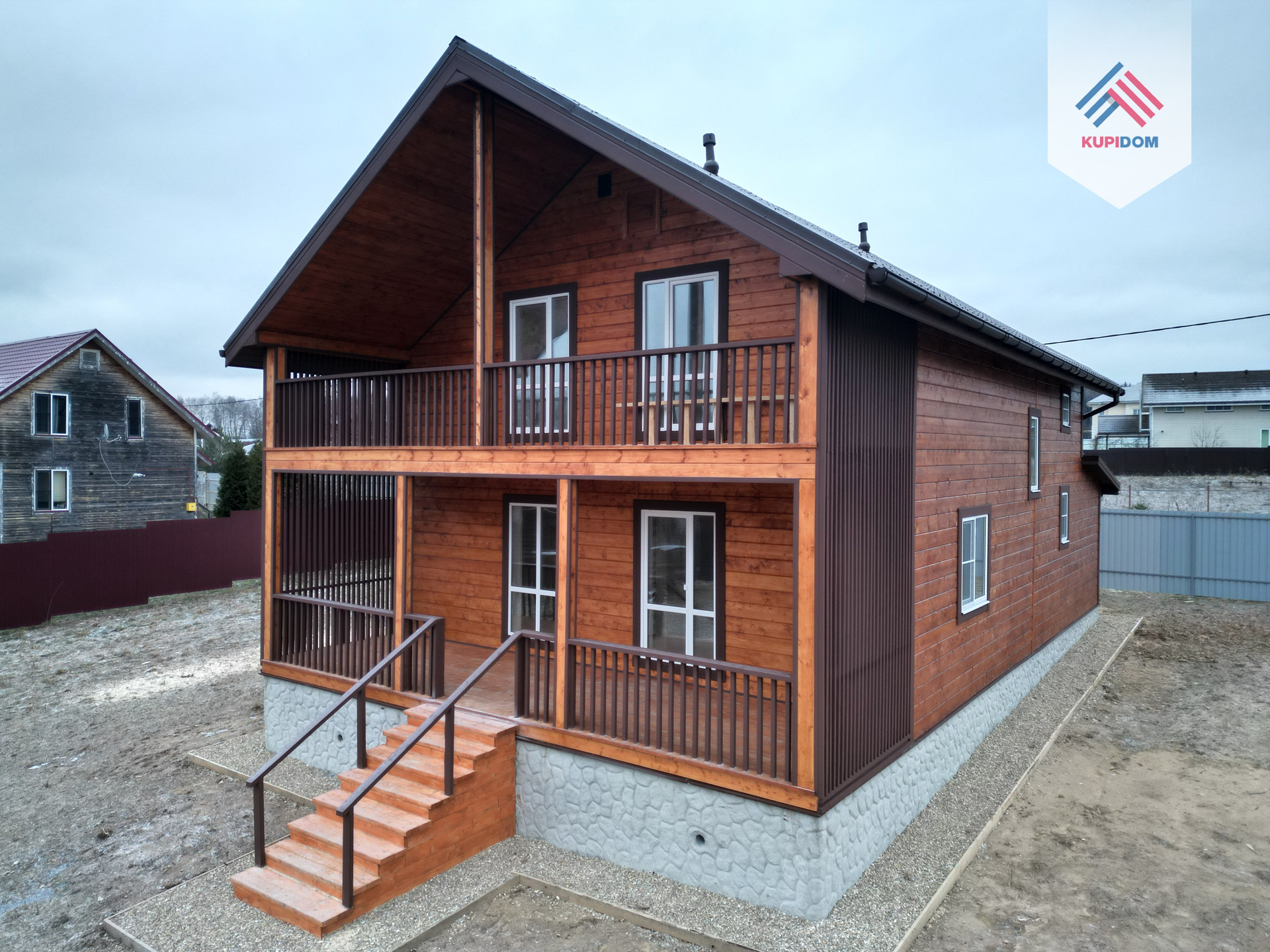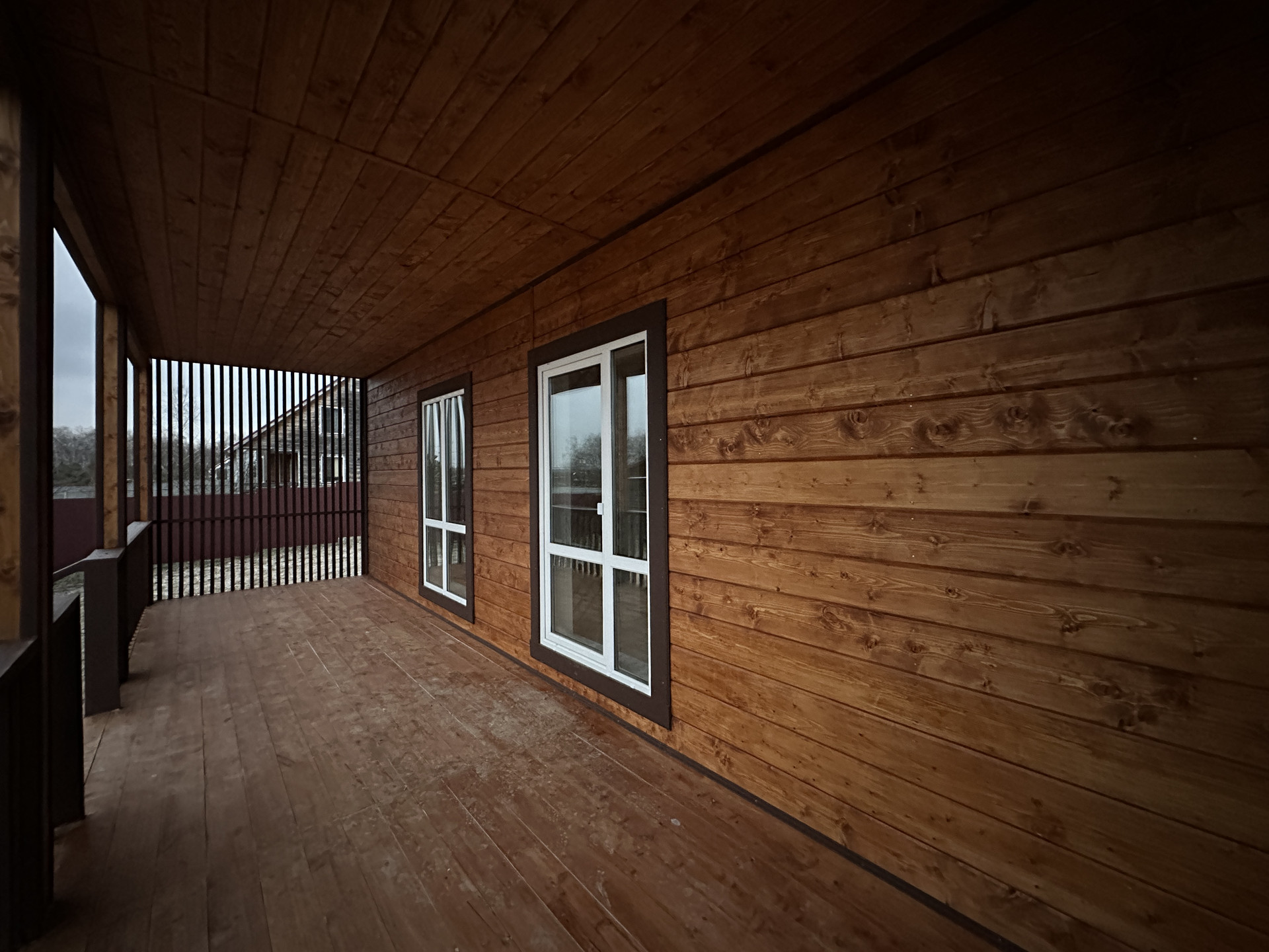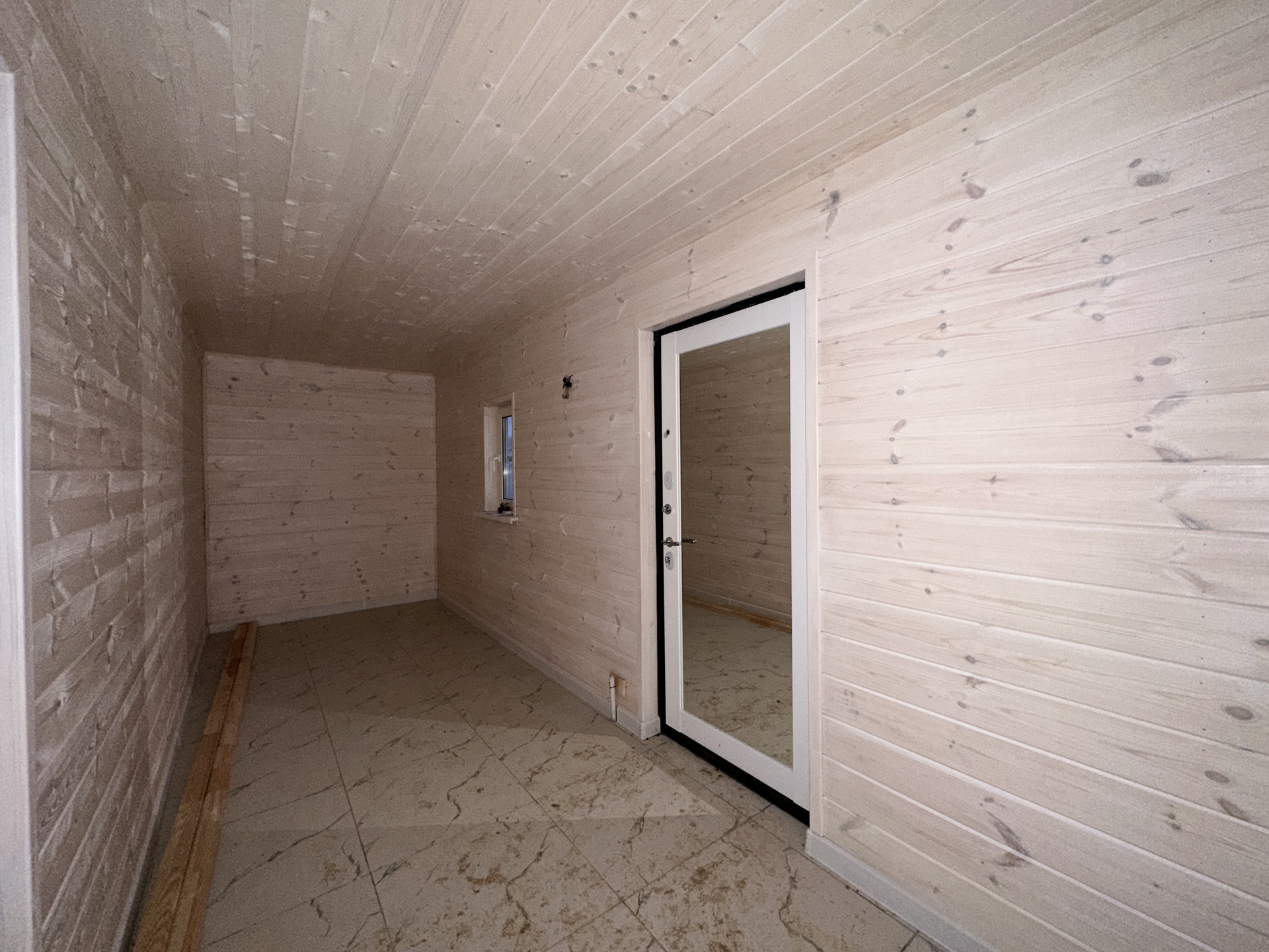 Фундамент - армированная монолитная плита; Стены - брус 100х150мм + утепление 100мм + обработанная имитация бруса; Кровля - металлочерепица с утеплением; Установлена вентиляционная система; Уличное освещение; Окна - стеклопакеты поворотно-откидные двухкамерные; Внутренняя отделка: пол - керамогранит/ламинат; стены - имитация бруса.