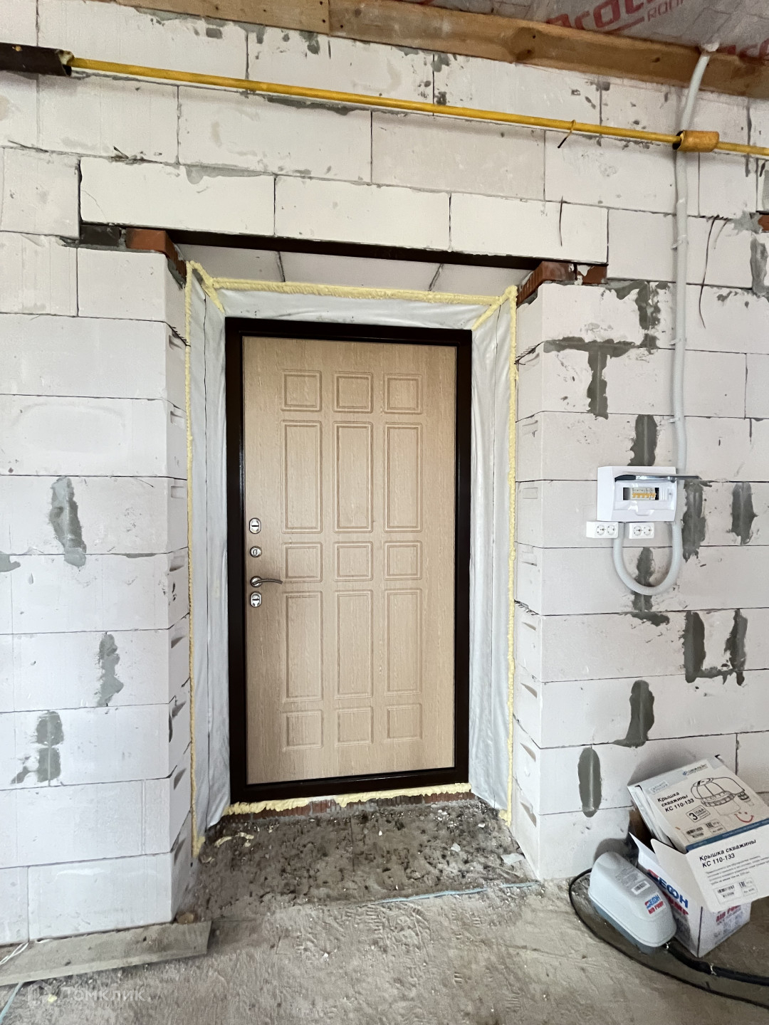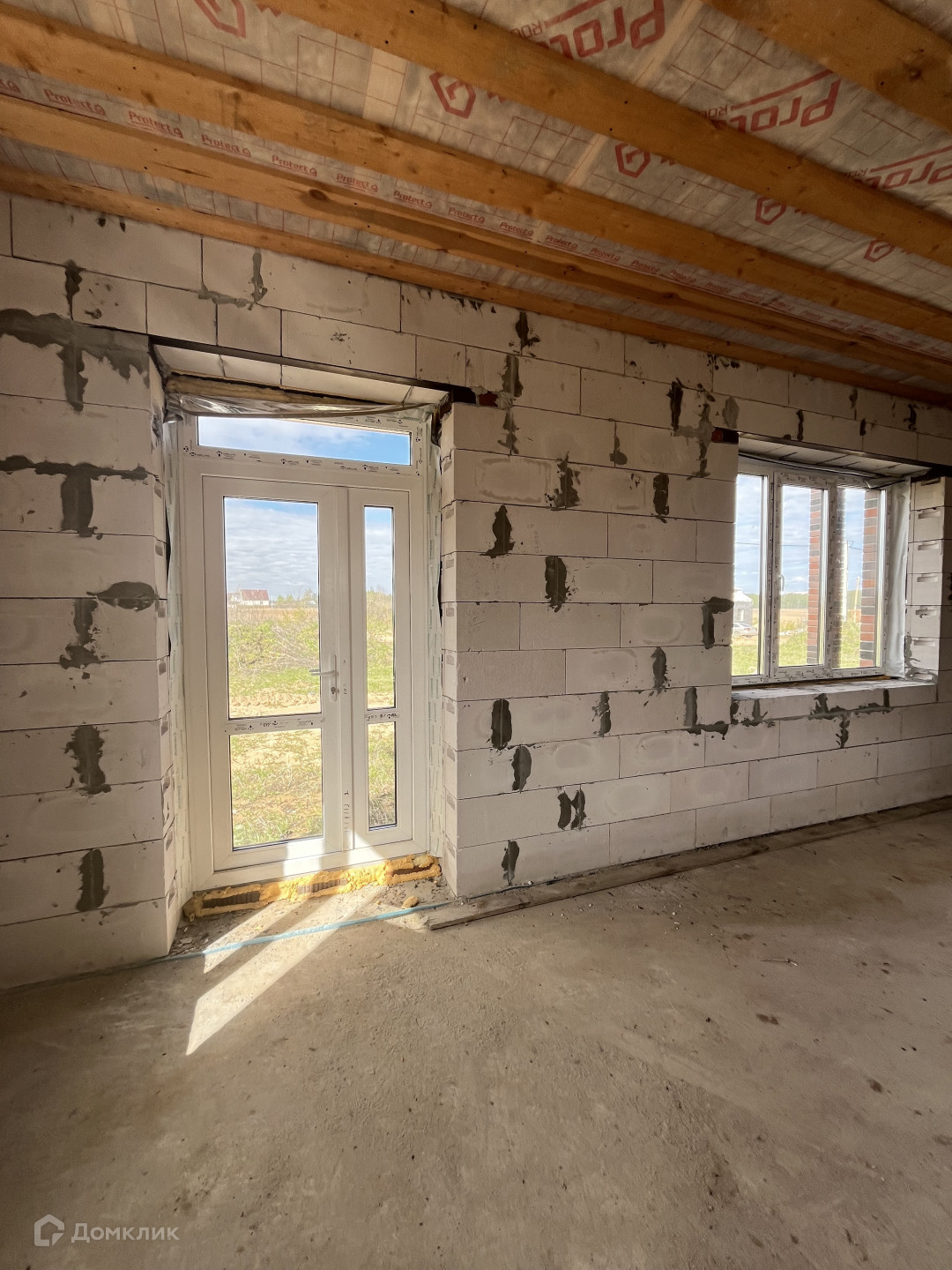 Дом выполнен из пеноблока и облицован кирпичом.