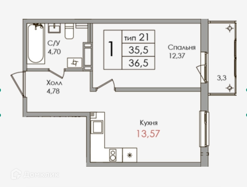 Балкон, лоджия 1 балкон