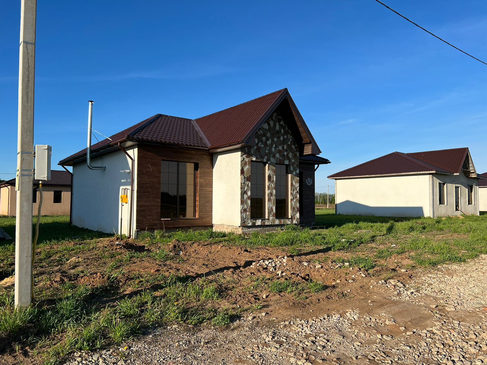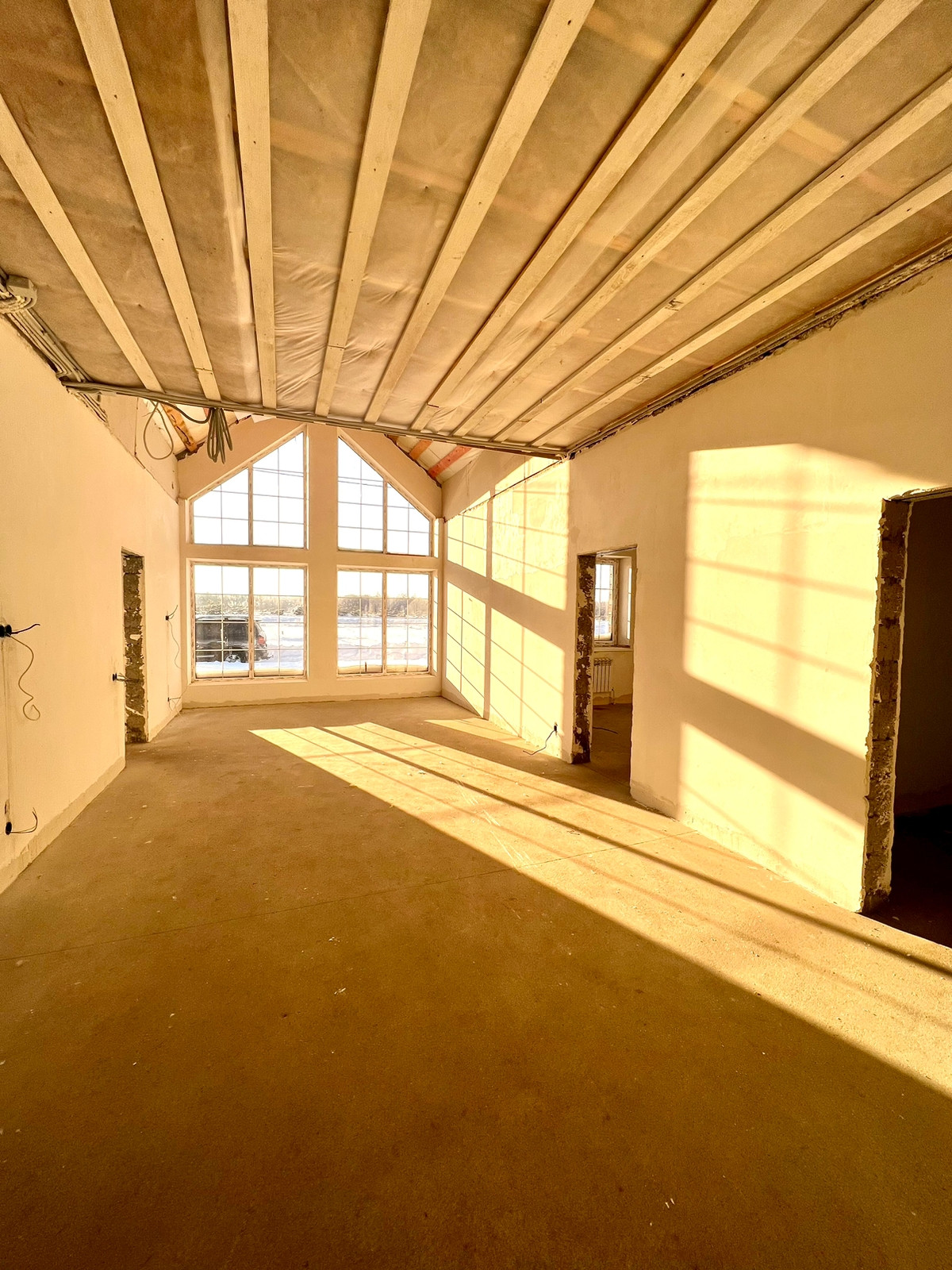 Стены оштукатурены, электропроводка с эл.щитом, стяжка, теплые полы, двухкамерный газовый котел. Высокие потолки. Тройной стеклопакет. Панорамное остекление.