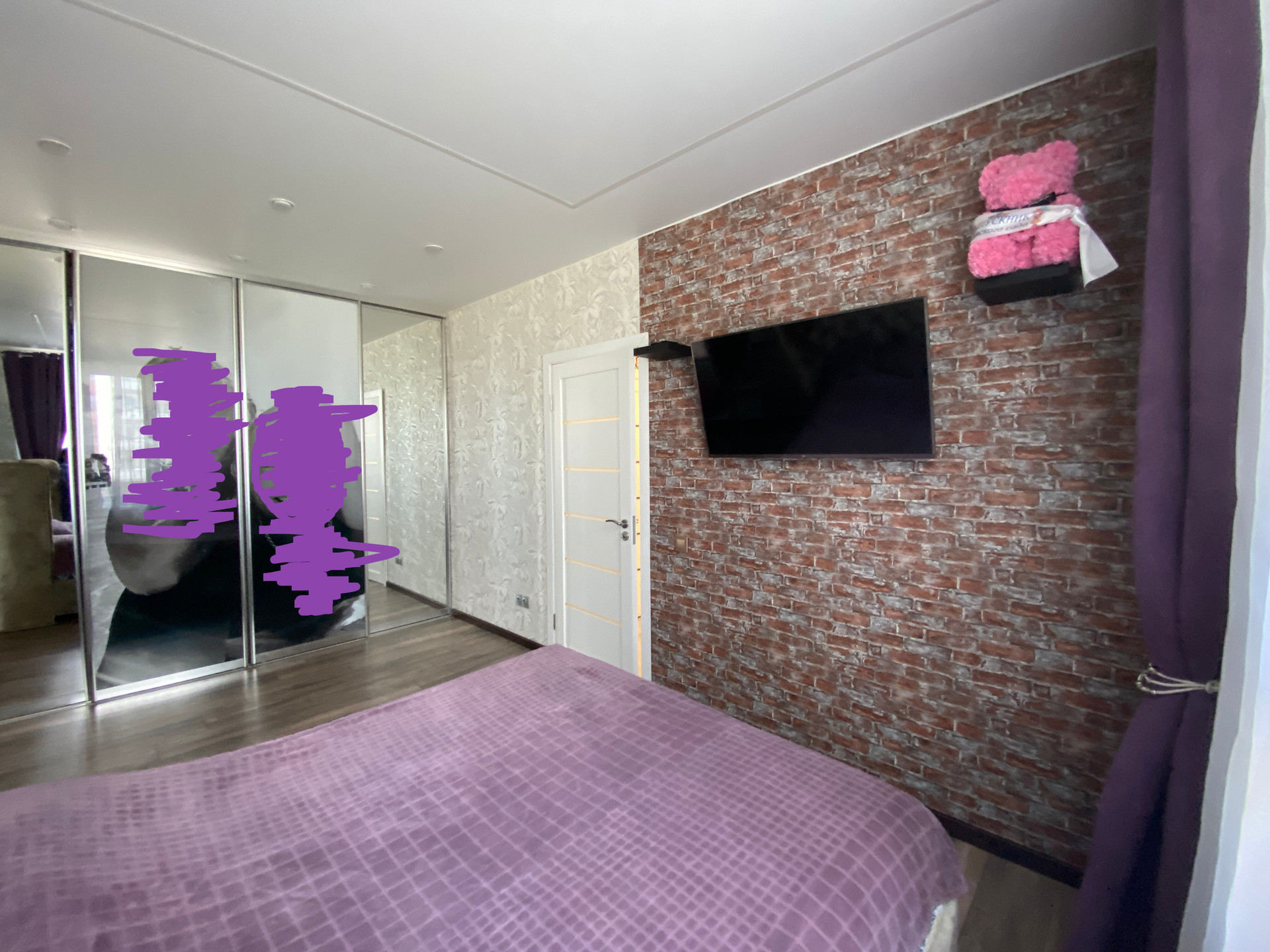 - детская комната 15.3 кв.м, остается покупателю встроенная мебель, полки навесные, карниз + рулонные шторы, вся мебель делалась на заказ, окна детской выходят на северо-восток, 2-х уровневый потолок с подсветкой и ночником,