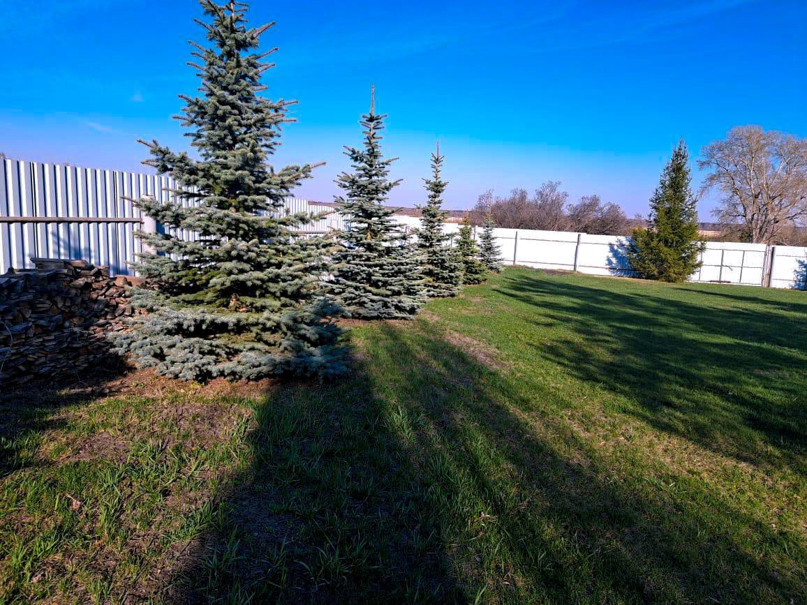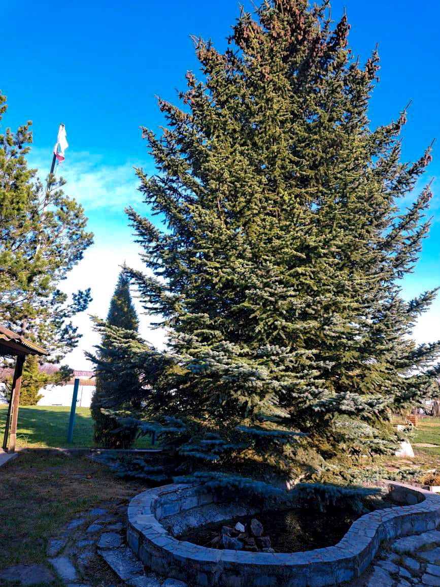 - На территории растет большая голубая ель, плакучая берёза, по периметру высажены хвойные деревья.