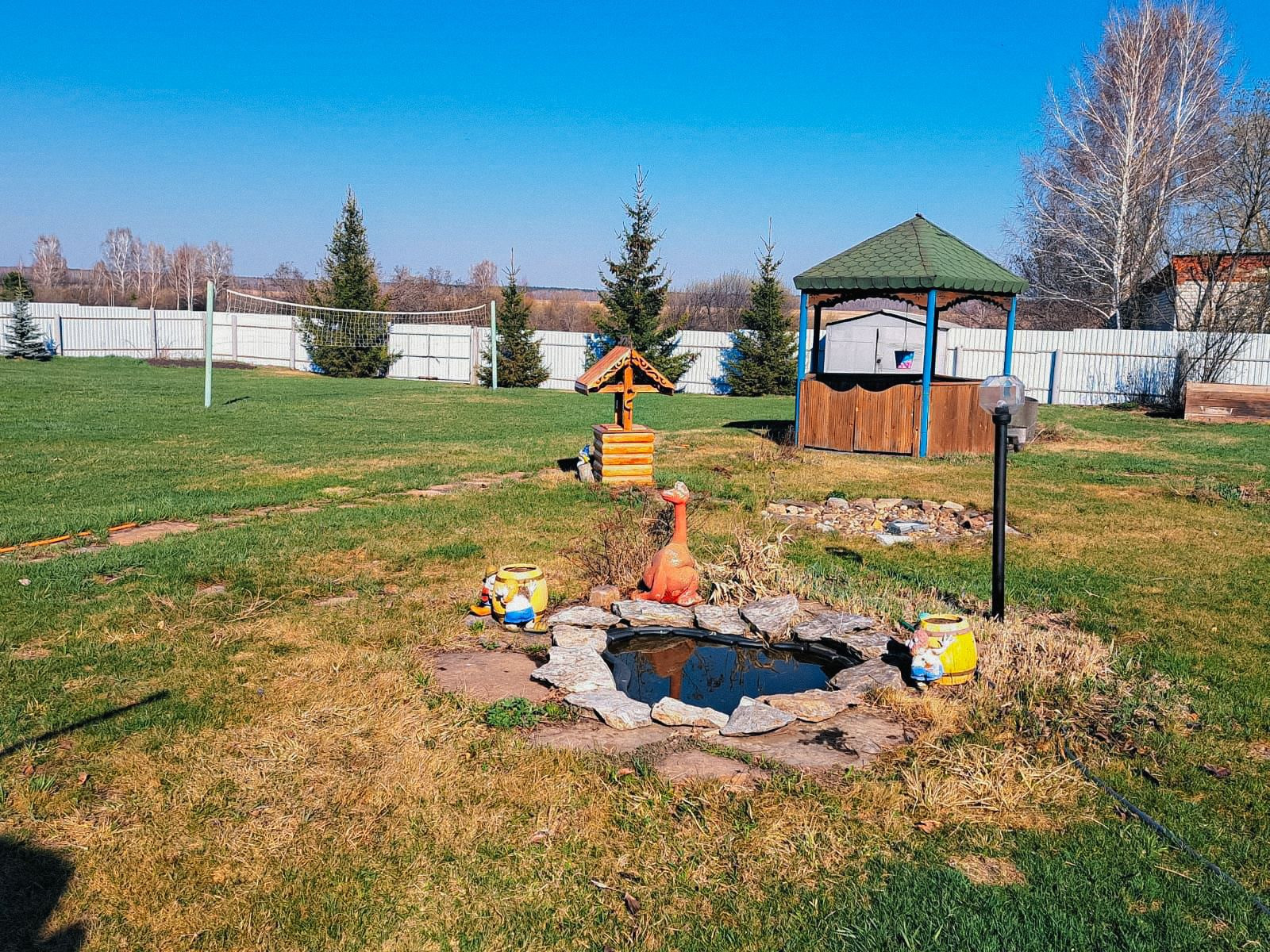 Территория дачи полностью огорожена забором с двумя воротами на противоположных сторонах участка для въезда авто/техники. Установлены камеры видеонаблюдения и звуковые сигнализации.