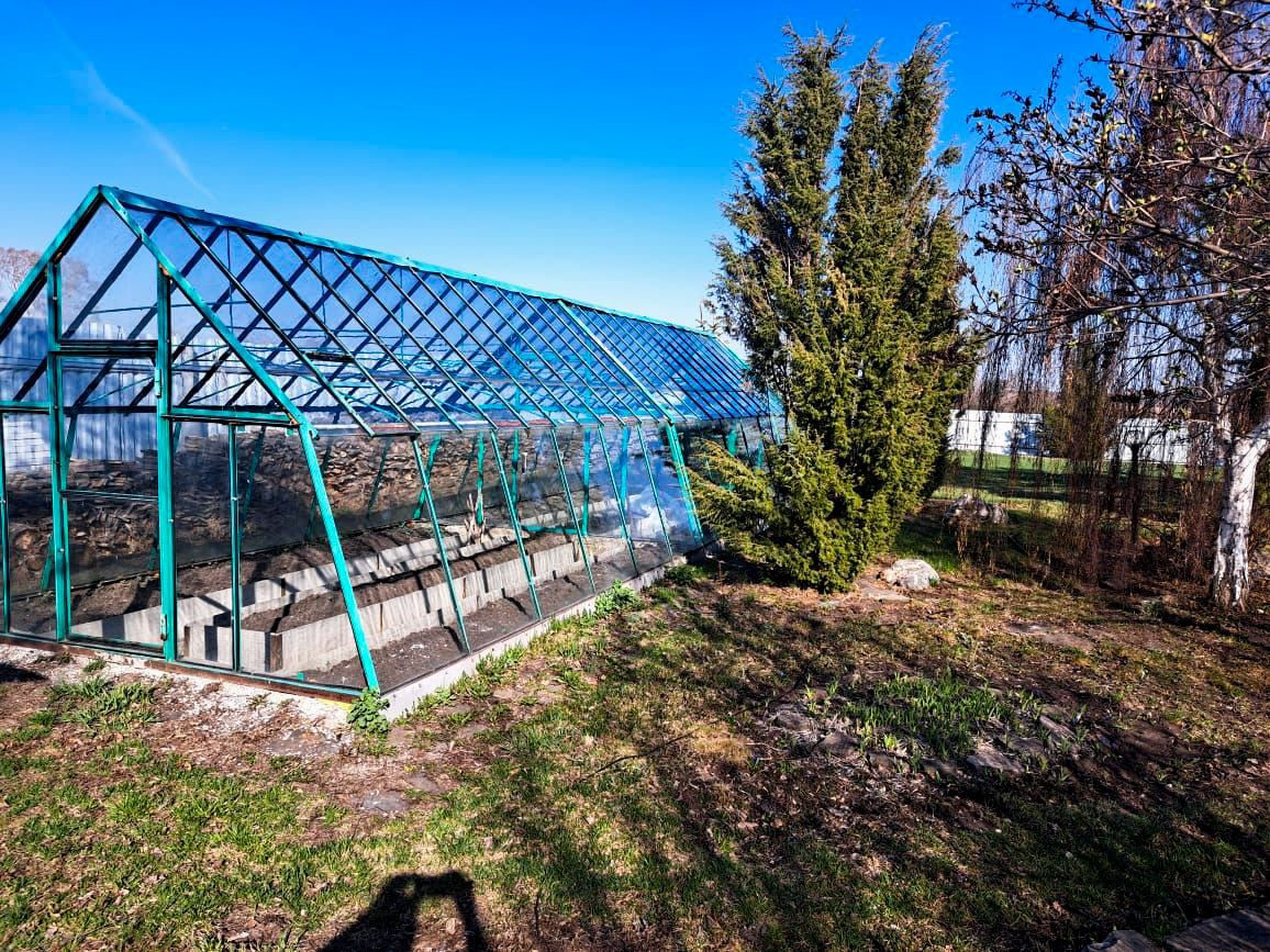- Стеклянная теплица с двумя отдельными входами;