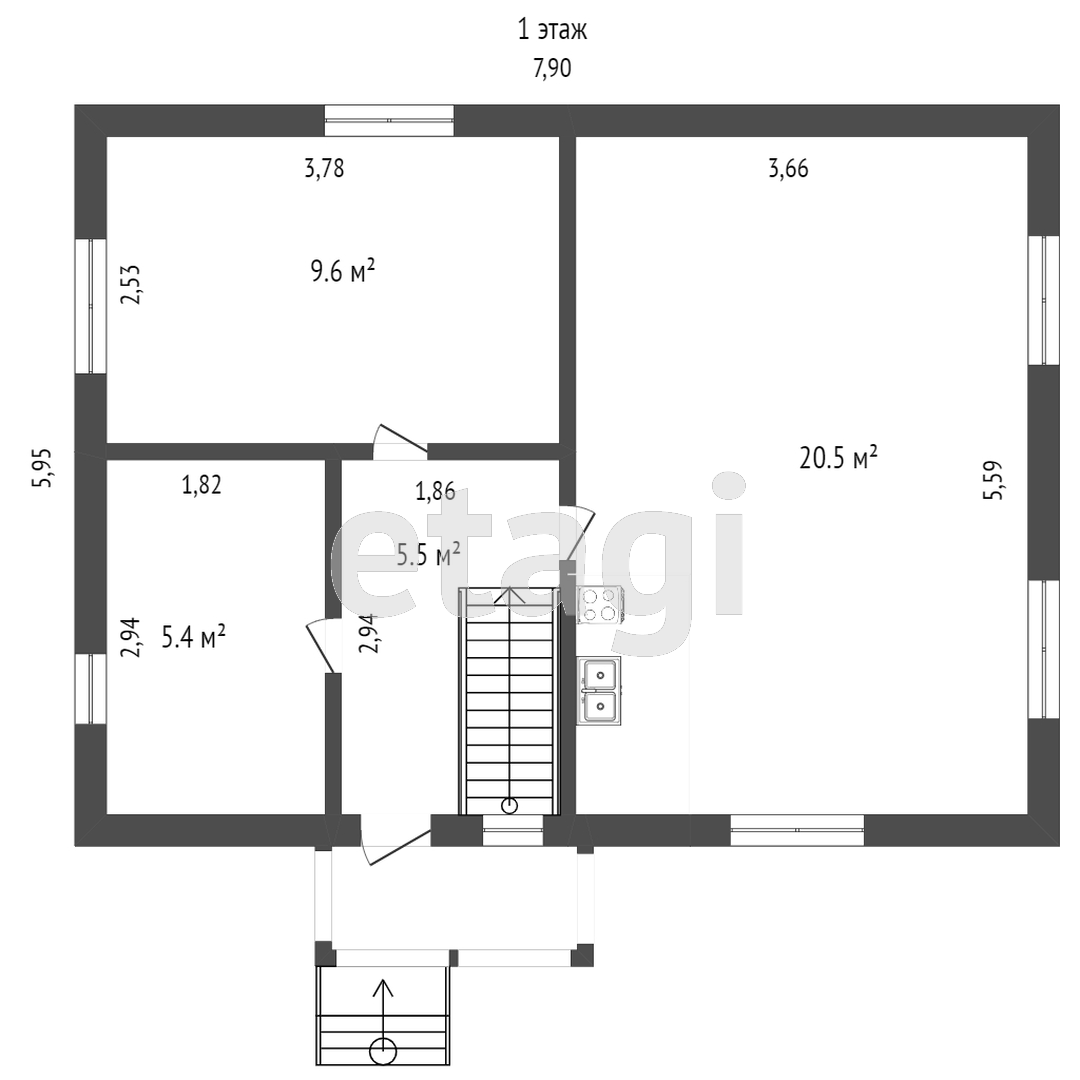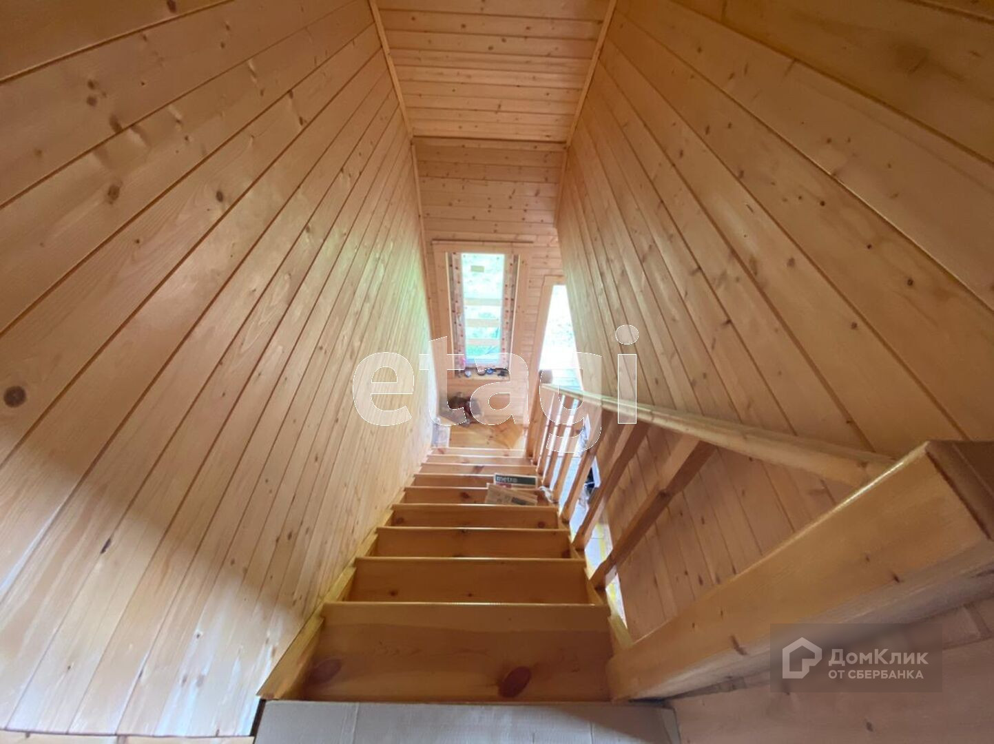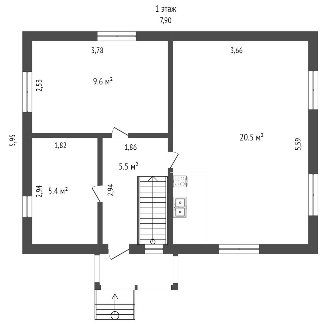 На первом этаже дома находятся просторная комната, кухня и ванная. Деревянная лестница ведет на второй этаж, где по обе стороны расположены светлые комнаты.