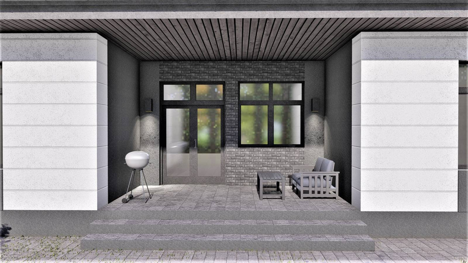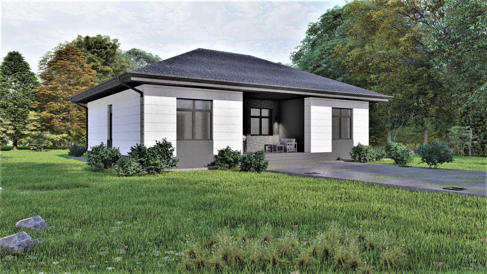 В доме есть терраса с выходом из просторной  кухни-гостиной, которая располагается под оной крышей с домом. При необходимости ее модно утеплить и сделать зимний сад или кабинет.